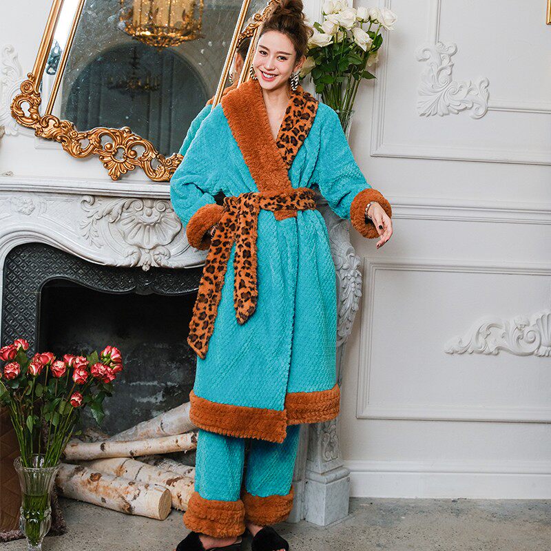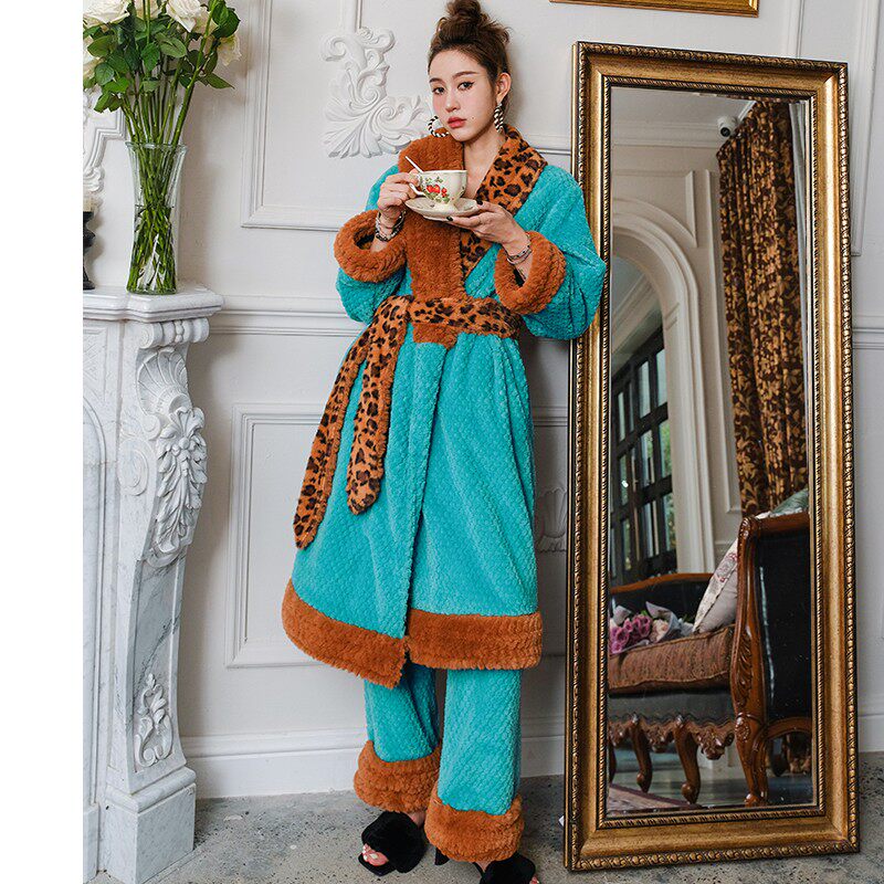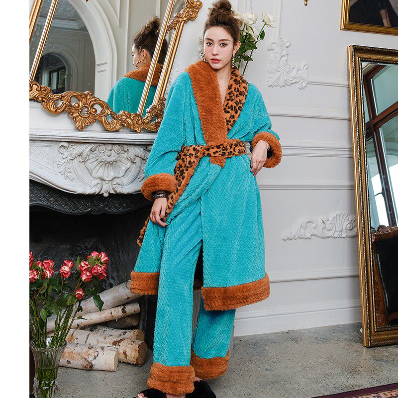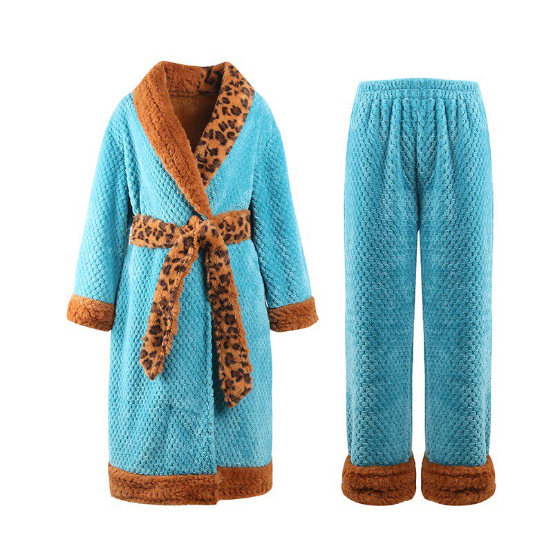 Original Extravagant Collision Color Lake Blue Two-piece Sleepwear Lace-up Warm Home Dress Exterior Wear Pyjamas Flannel Flannel Thicken-Taobao