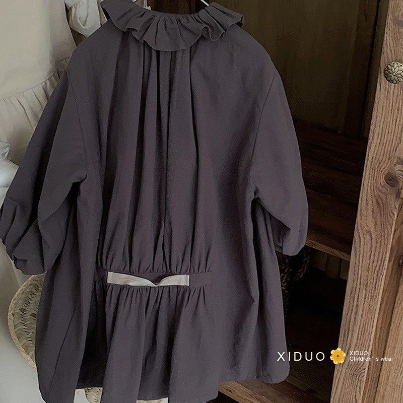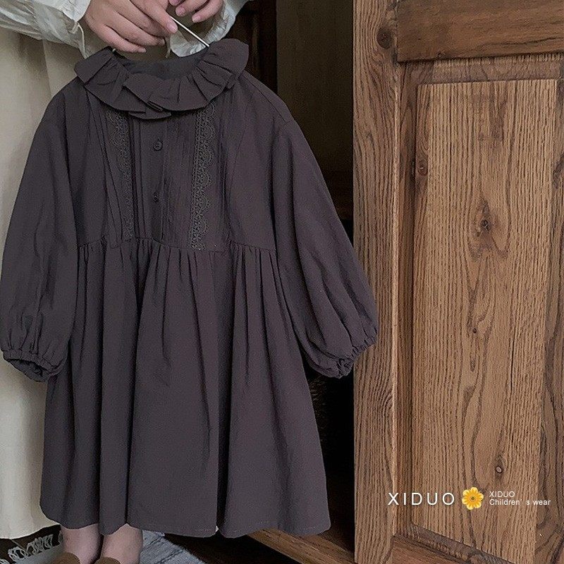 South Korean children's clothing girl dress with dress fall new foreign air pure color vintage lace collar bubble sleeves loose A-word dress-Taobao
