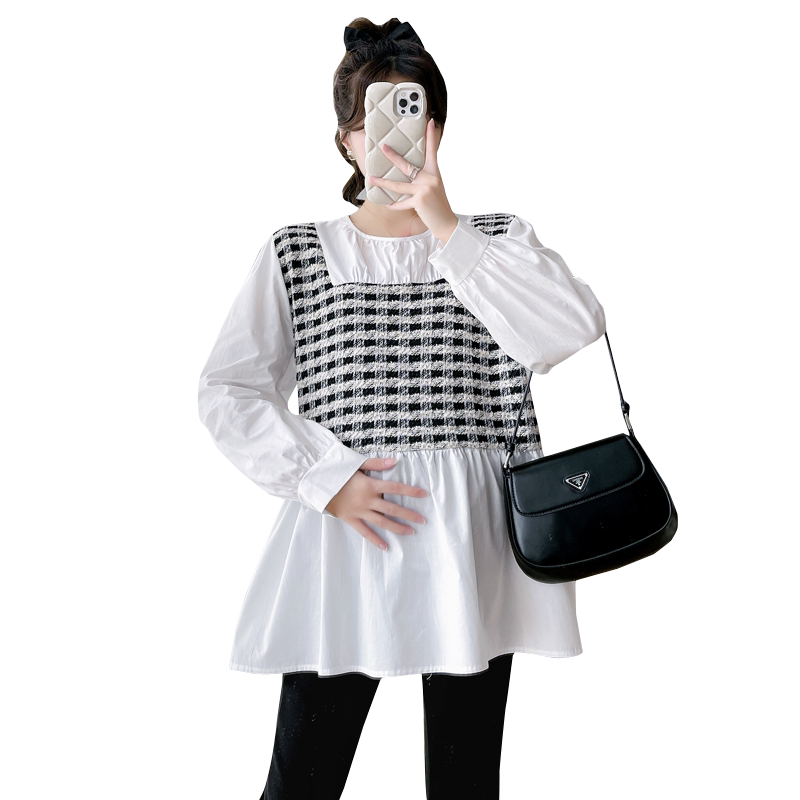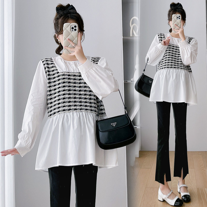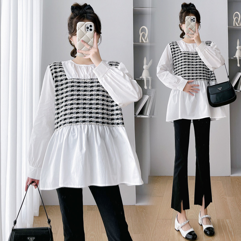 2023 pregnant women's autumn new small fragrant wind box splicing fake two loose doll-shirt blouses lining gestational maternity dress-Taobao