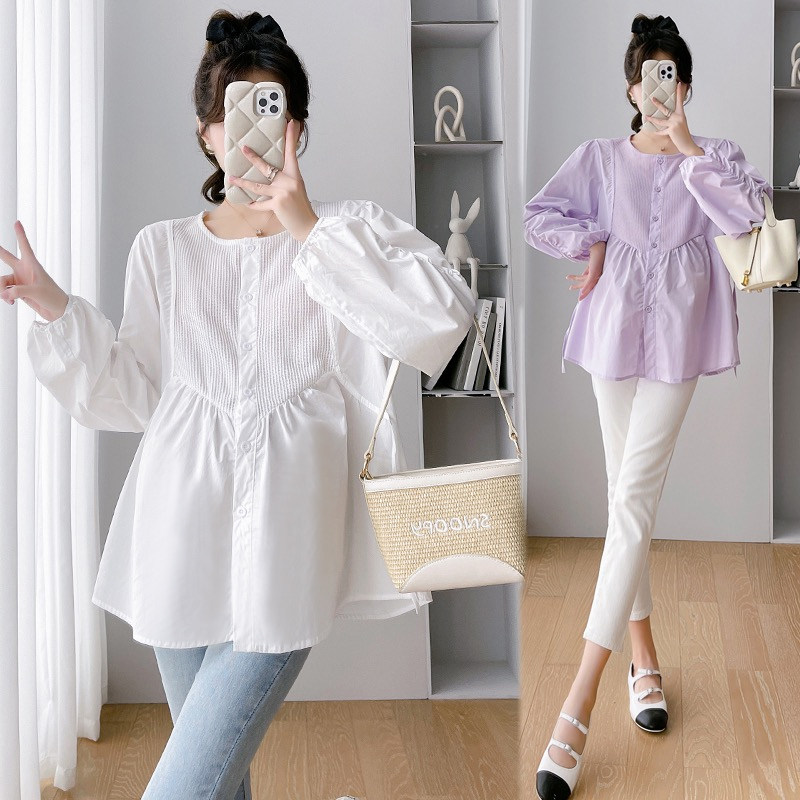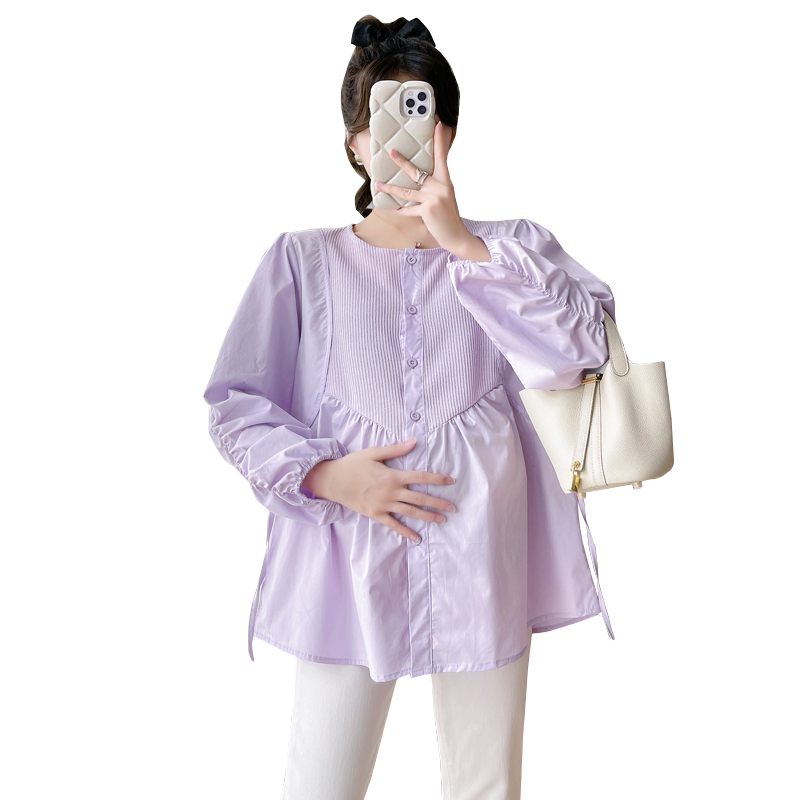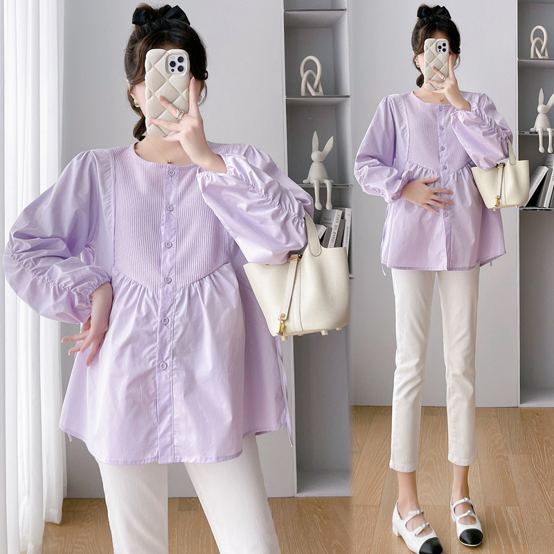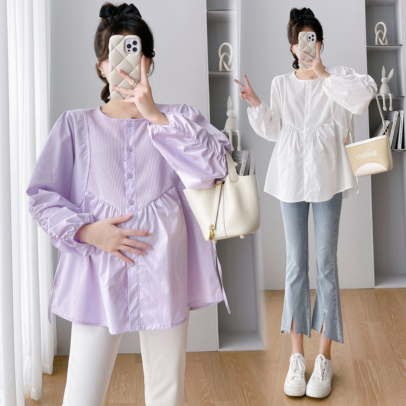 2023 pregnant women Fall new Korean version Fashion 100 Loose Slim Rounded Collar Long Sleeve Shirt Splicing Blouse Shirt-Taobao