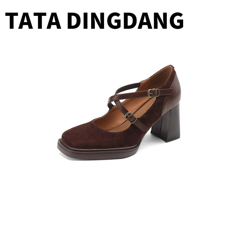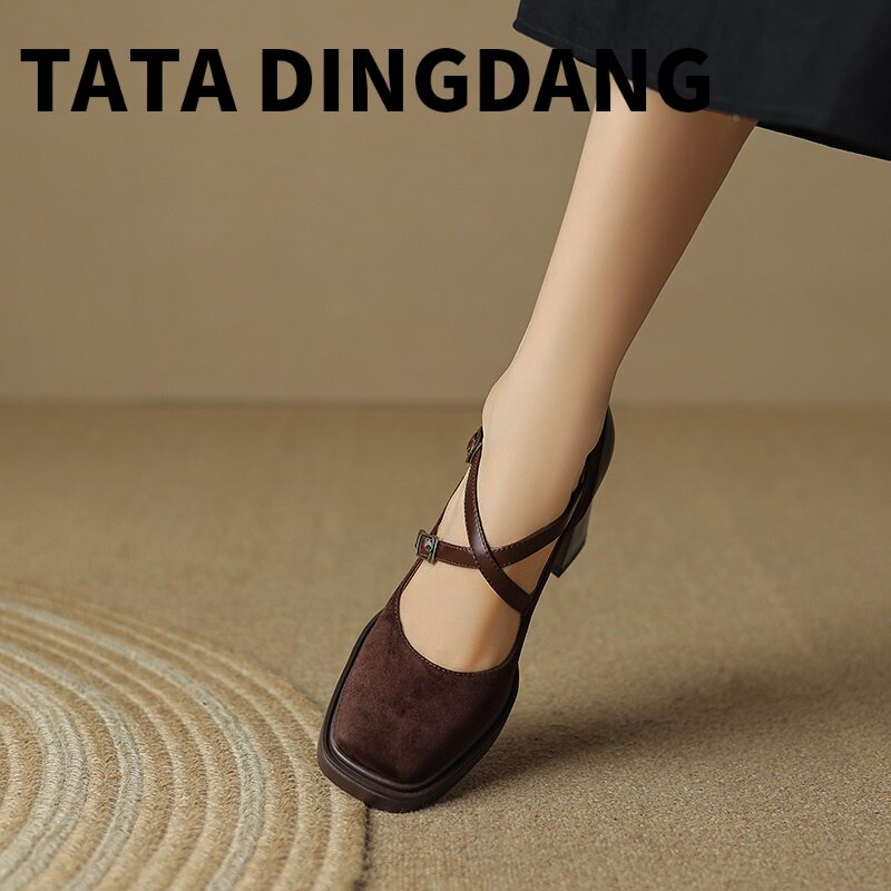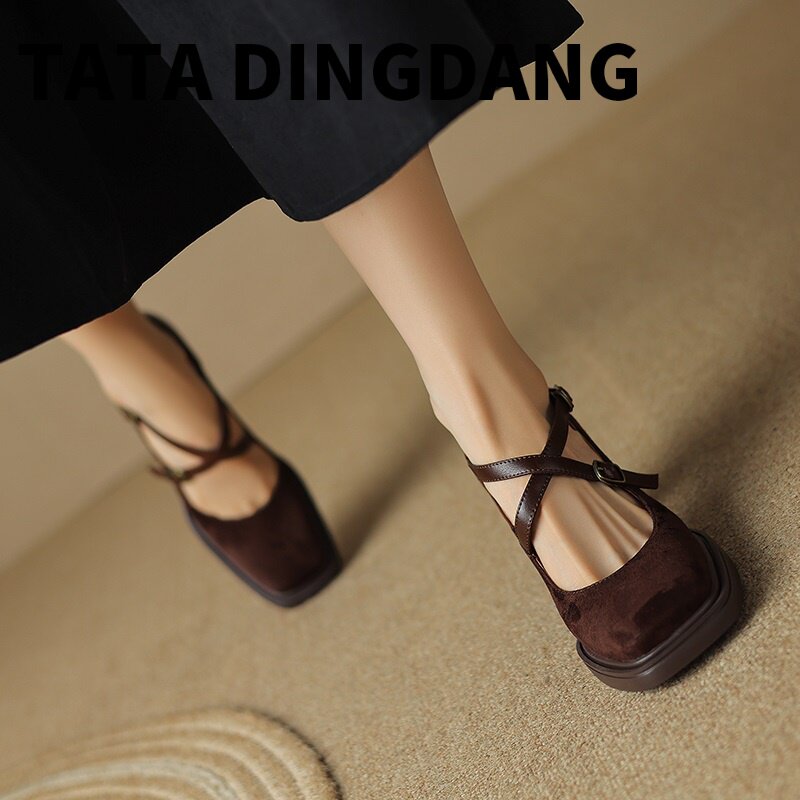 TATA DINGDANG He she dresses retro square head Mari Jean Shoes Woman Elegant Coarse Heel Cross Cingulum Single Shoes-Taobao