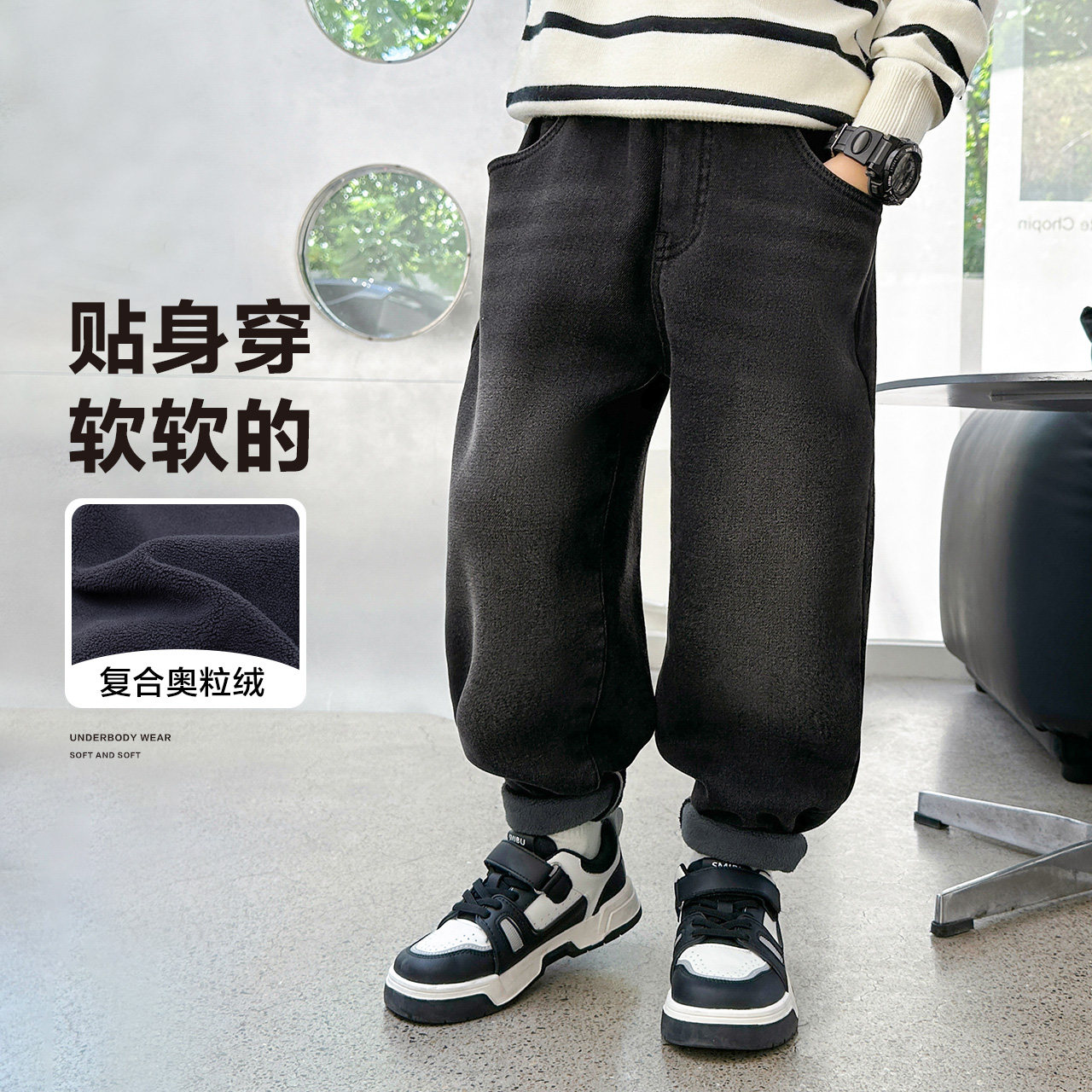 Left West Boy Clothing Boy Plus Suede Jeans Autumn Winter 2023 New Loose Casual Children Warm Long Pants Winter-Taobao
