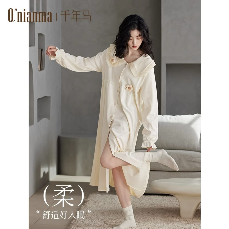 Sleeping Dress Lady Fall Long Sleeve Spring Autumn Style Sleeping Clothes Doll Collar Cute Flowers Loose big code Home Residence Medium Long-Taobao