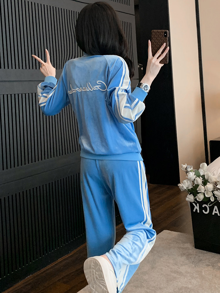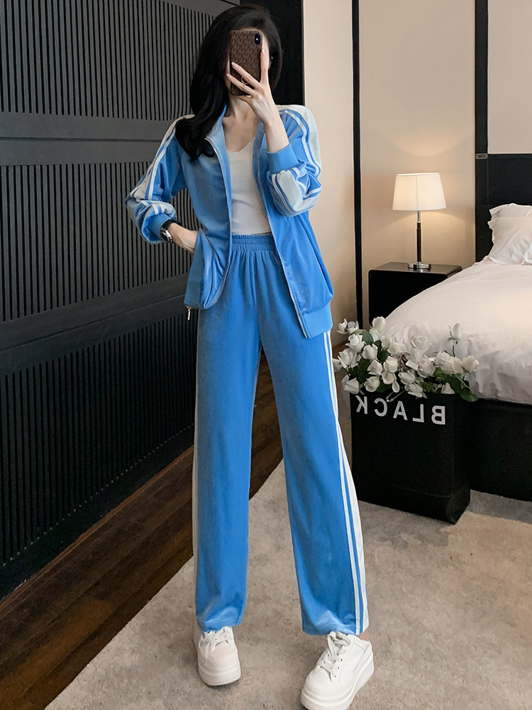 Net Red Burst Casual Sports Suit Women's Autumn Clothing New Vee Cardiovert Jacket Straight Barrel Pants College Wind two sets-Taobao