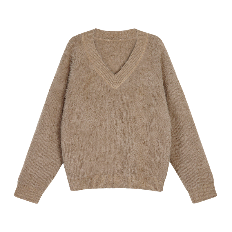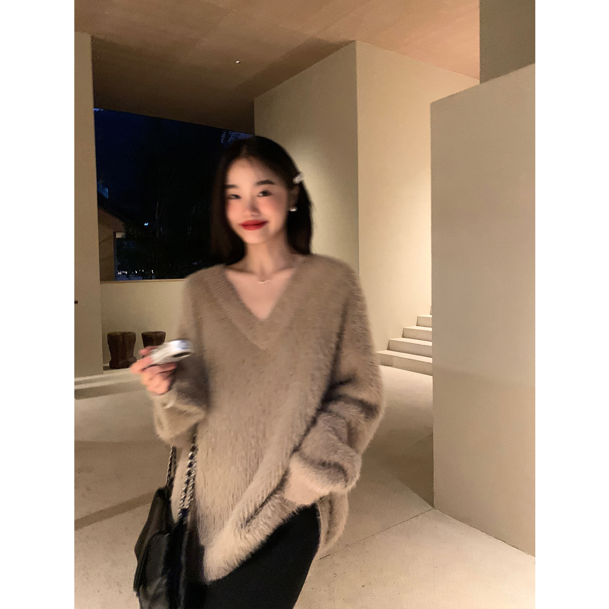 puumede black imitation mink fur v collar sweater woman advanced sensation slim soft glutinous loose sleeve head-knitted sweatshirt-Taobao
