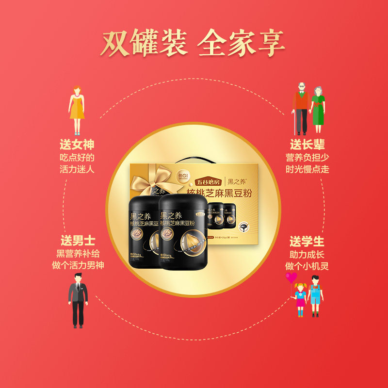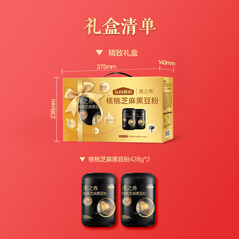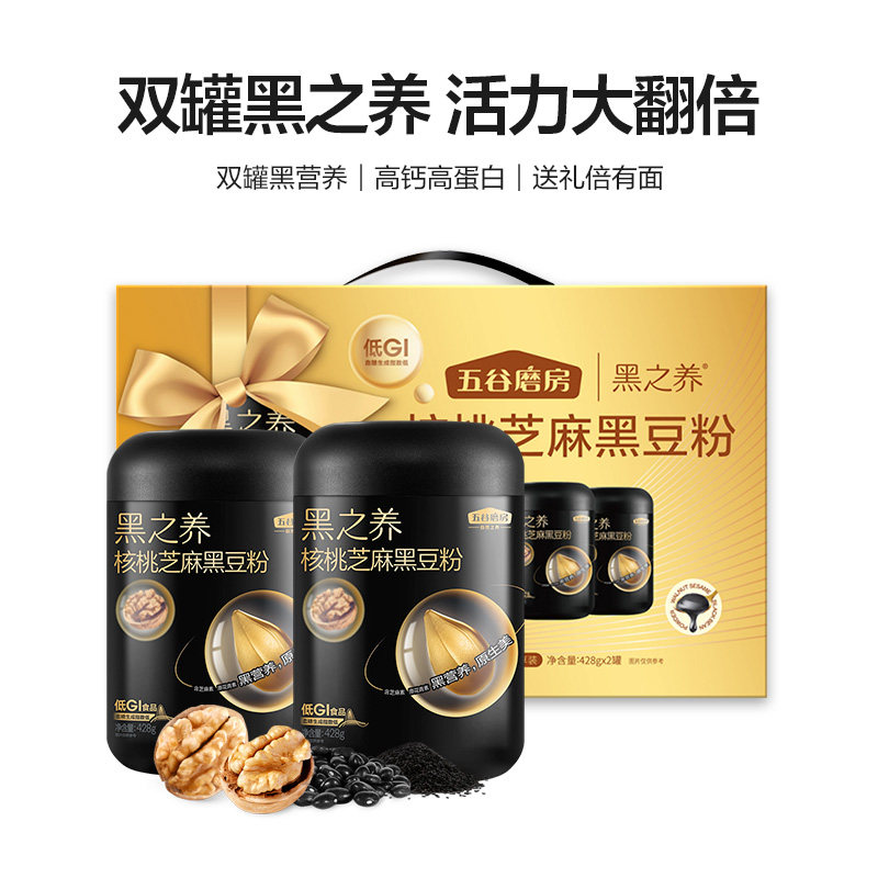 Five Valley Grinding Room Black Raised Walnut Black Sesame Powder Gift Box Dress 428g * 2 cans Black Sesame Burnt Nutritious meal JX-Taobao