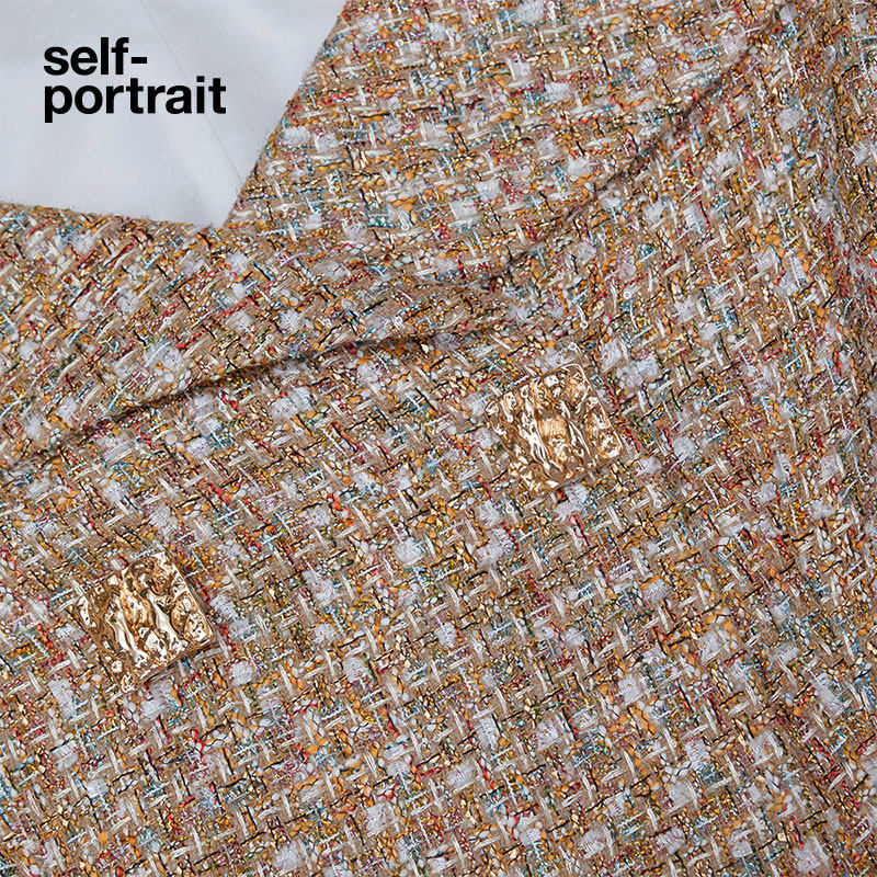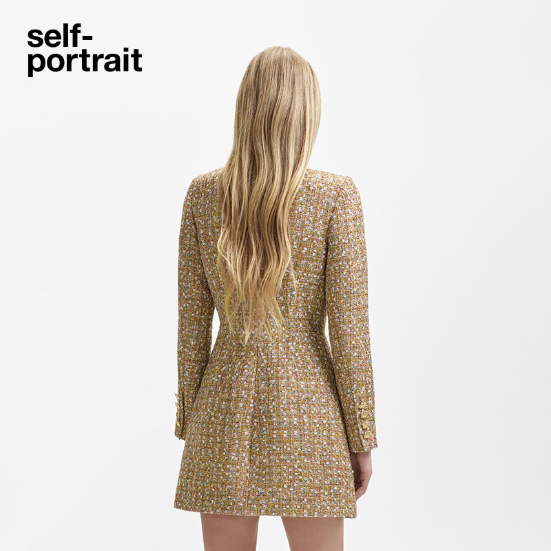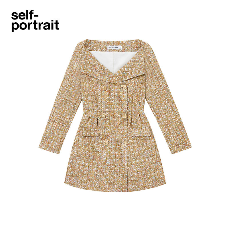 self-portrait 2023 autumn winter golden temperament elegant dew shoulder collection waist long sleeves short dress dress-Taobao