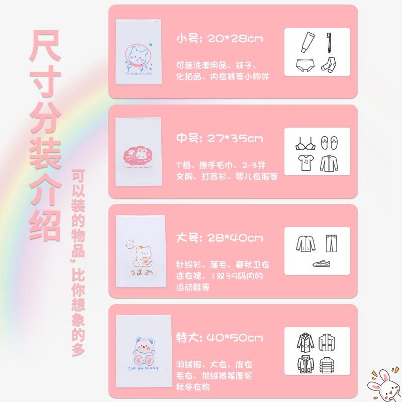 Small number 20 * 28cm (5 fitting) suitable for toiletries socks No. 24 * 35cm (5 fit) suitable for shirt towels large number 28 * 40cm (5 fitting) suitable