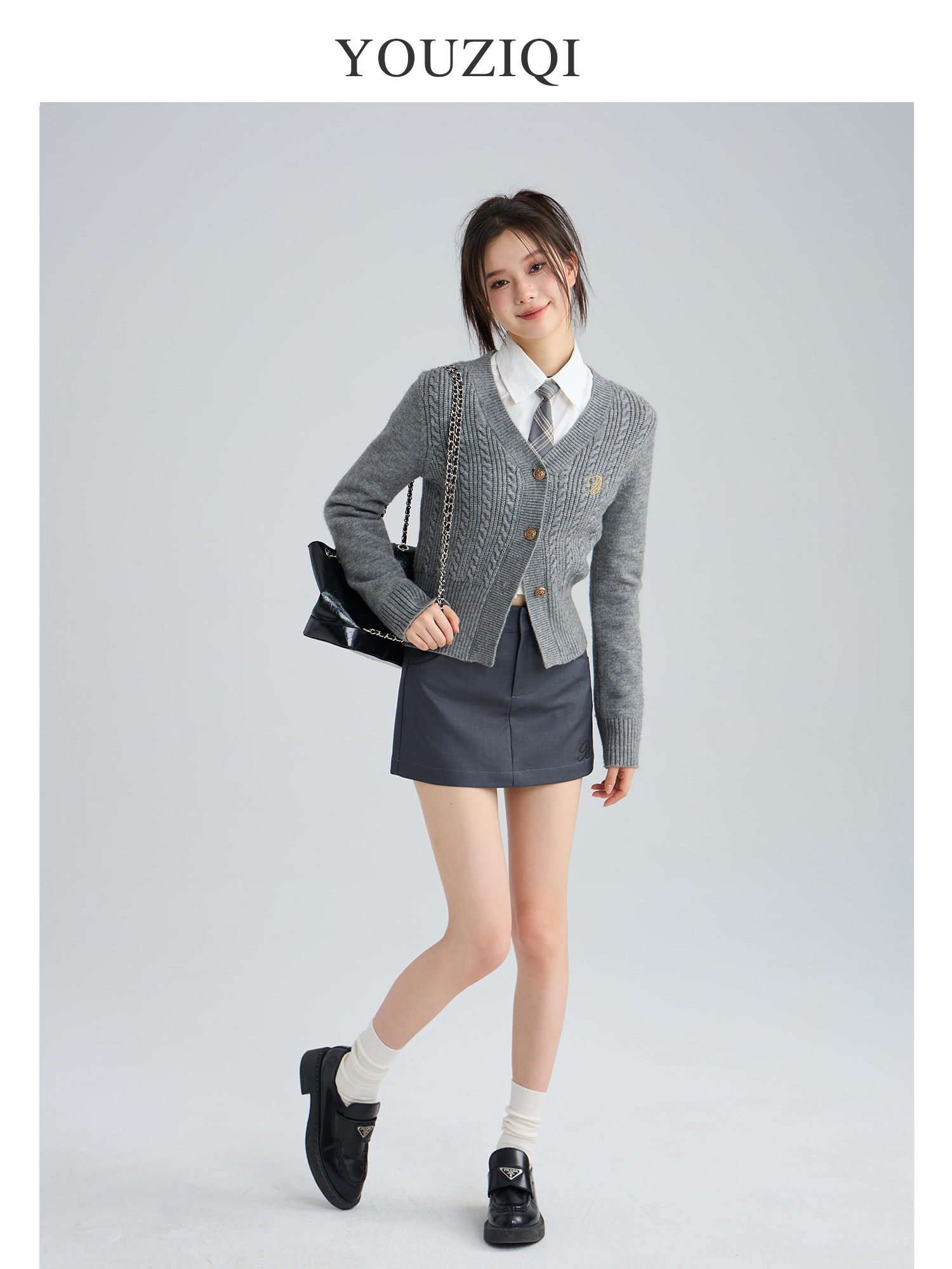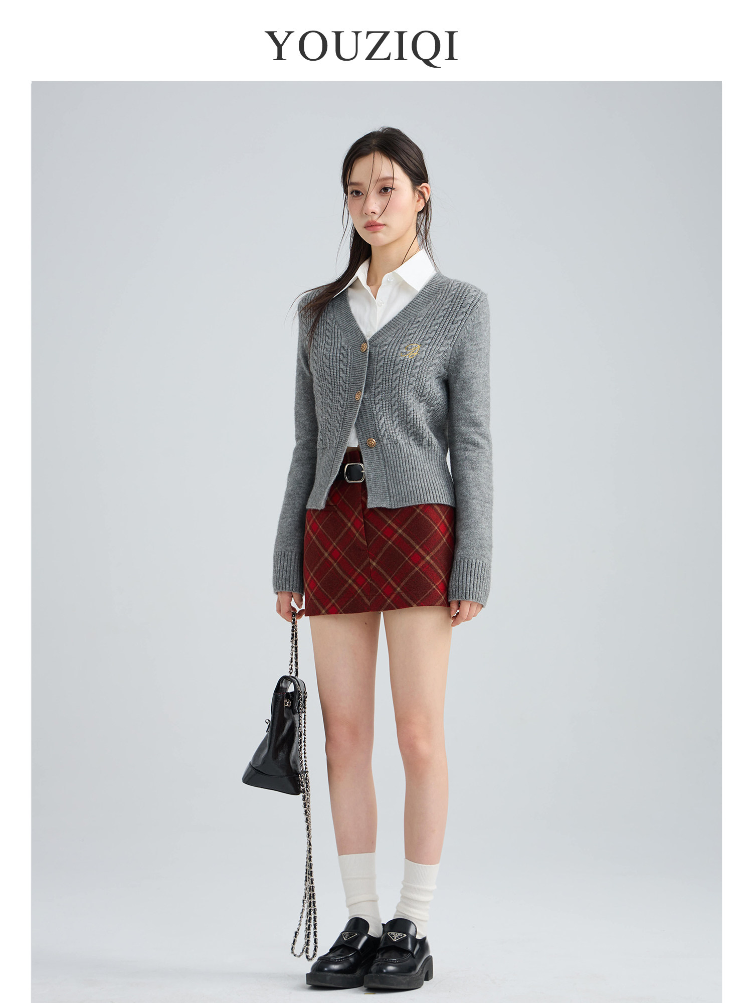 深蓝色开衫毛衣 深蓝色开衫毛衣- 浅奶灰开衫毛衣 浅奶灰开衫毛衣- 蓝色衬衫 白色衬衫 红色格子短裙 红色格子短裙- 黑色短裙 灰色短裙