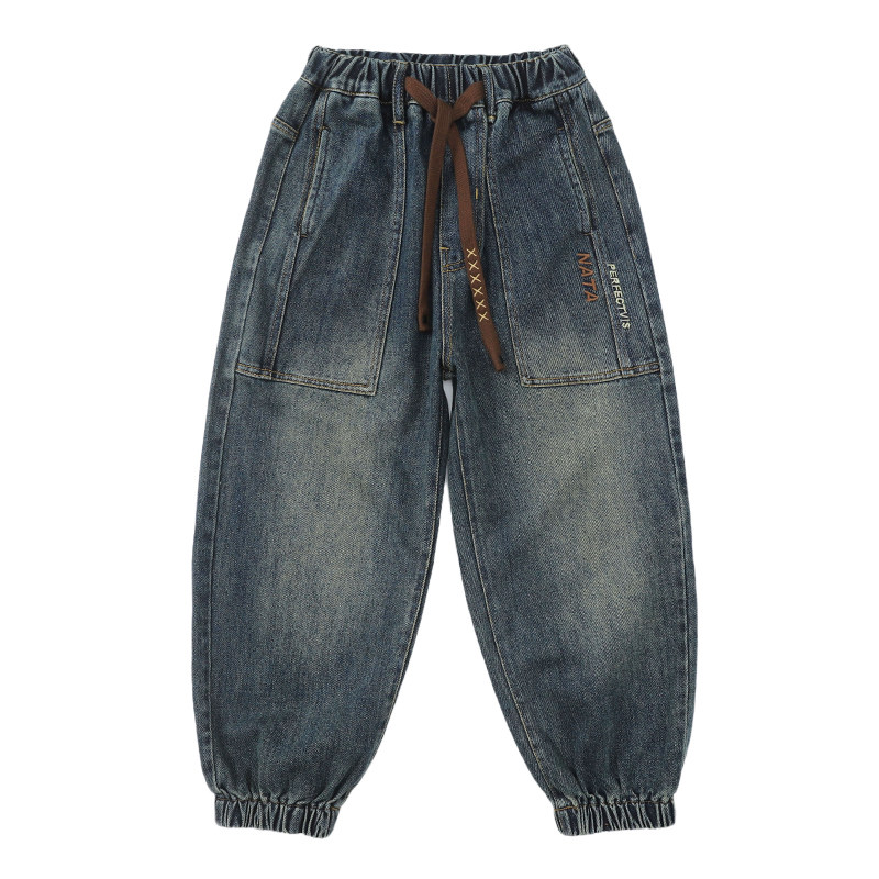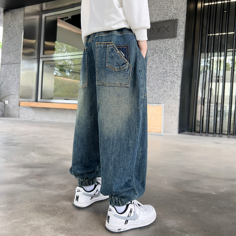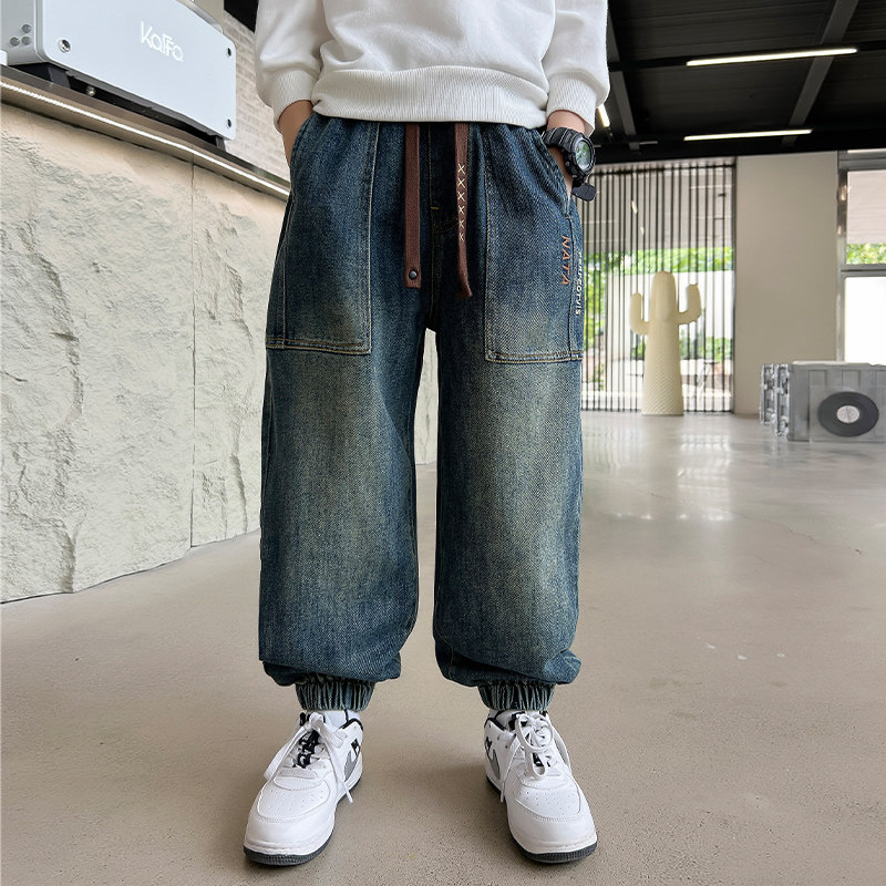 Spring Autumn Boy Jeans Trousers Long Pants 2023 Autumn Winter New Tide Large Children Straight Cylinder Loose Tooling Thickened add-down-Taobao