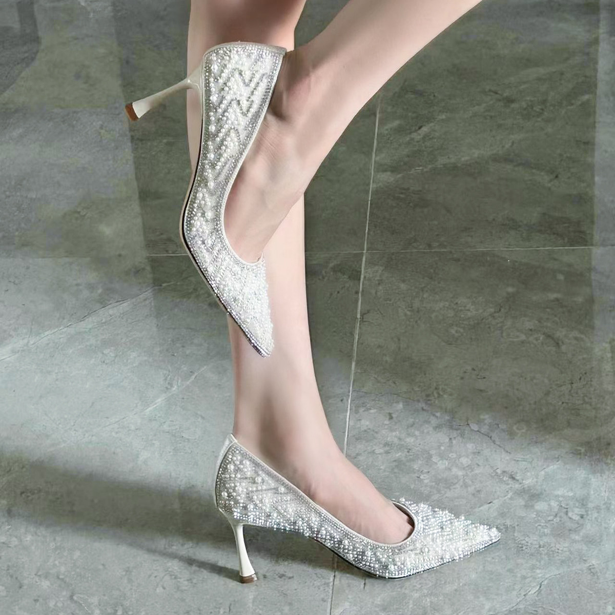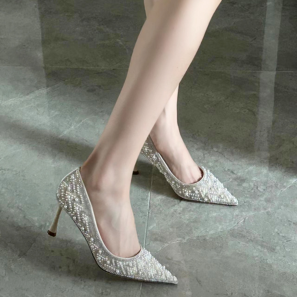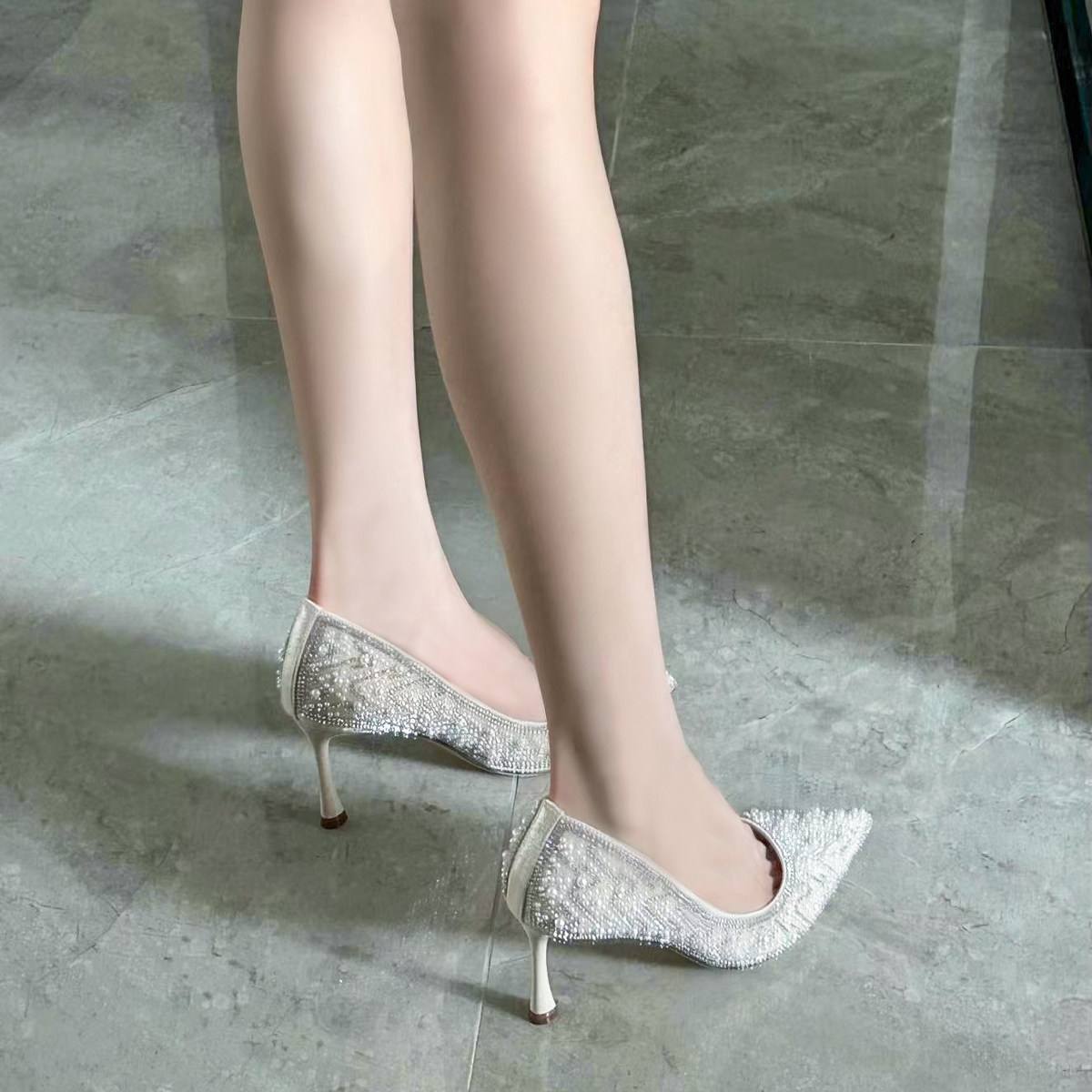 Rare Yia's New Pointed Crystal Pearls Full Drill High Heels Woman Not Tired Feet Fine With Single Shoes Everyday Wedding Shoes-Taobao
