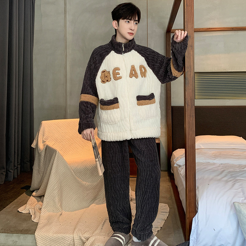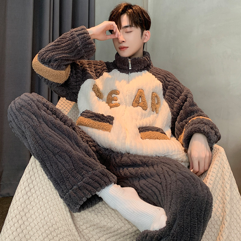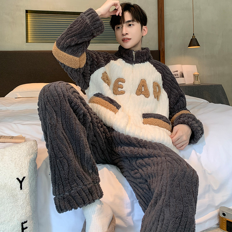 Sleepwear Male Coral Suede Winter Plus Suede Thickened Boy Zipper Warm Flannel Suede Men's Winter Home Clothes-Taobao