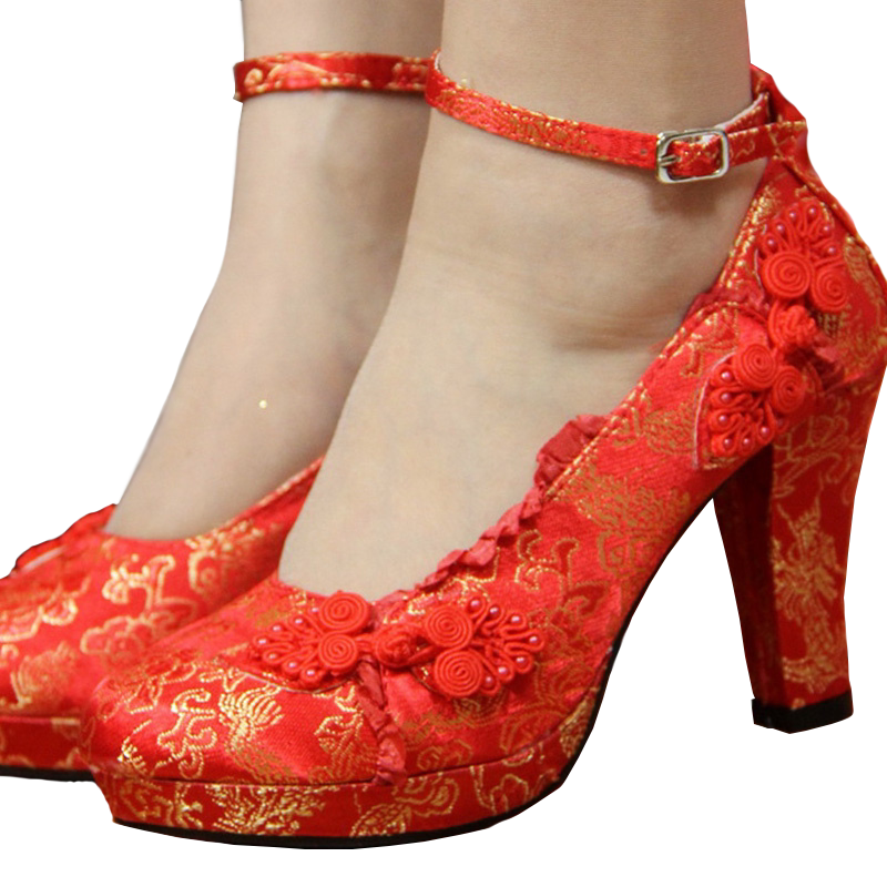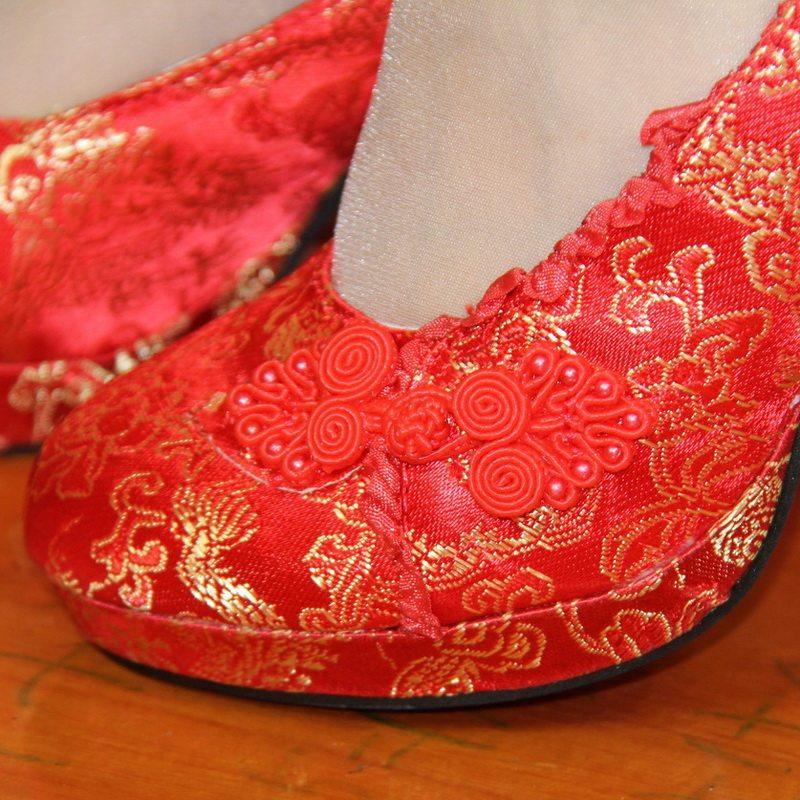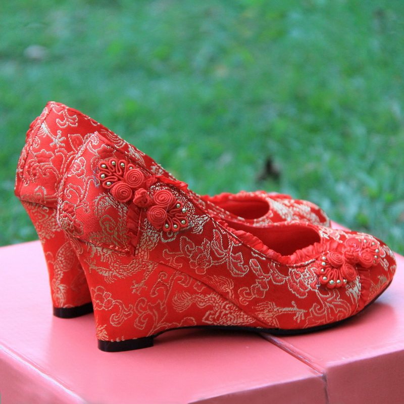 Wedding shoes red high-heeled bridal shoes classical cloth shoes dragon and phoenix satin buckle dress shoes women's shoes mid-heel and low-heel
