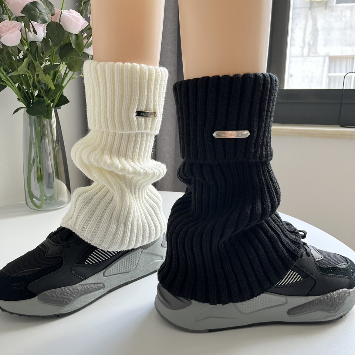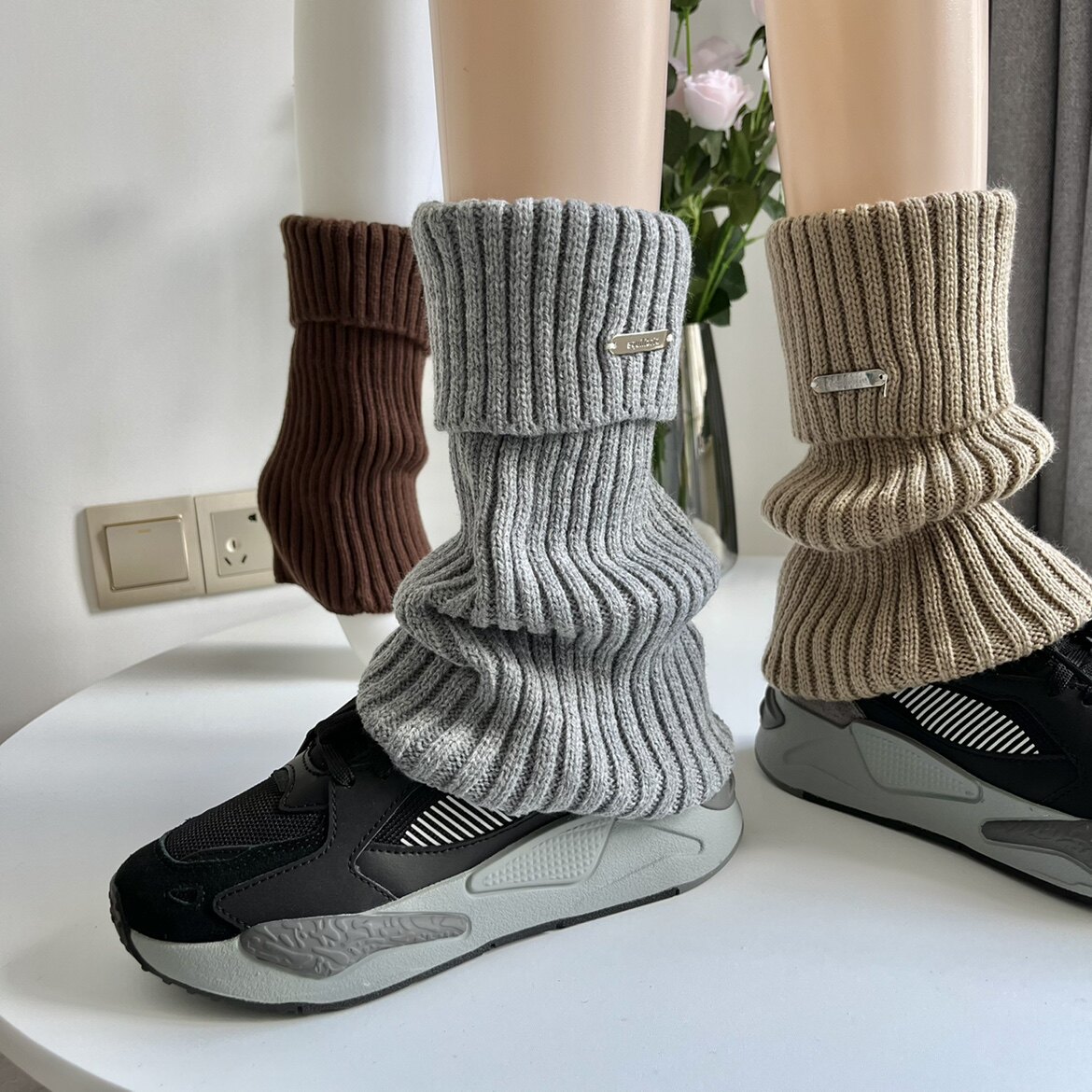 Turn Side Metal Mark American Retro Coffee Brown Socks Jacket Woman Autumn Winter Thickened Warm Display Slim Knit Leg Set Tide-Taobao