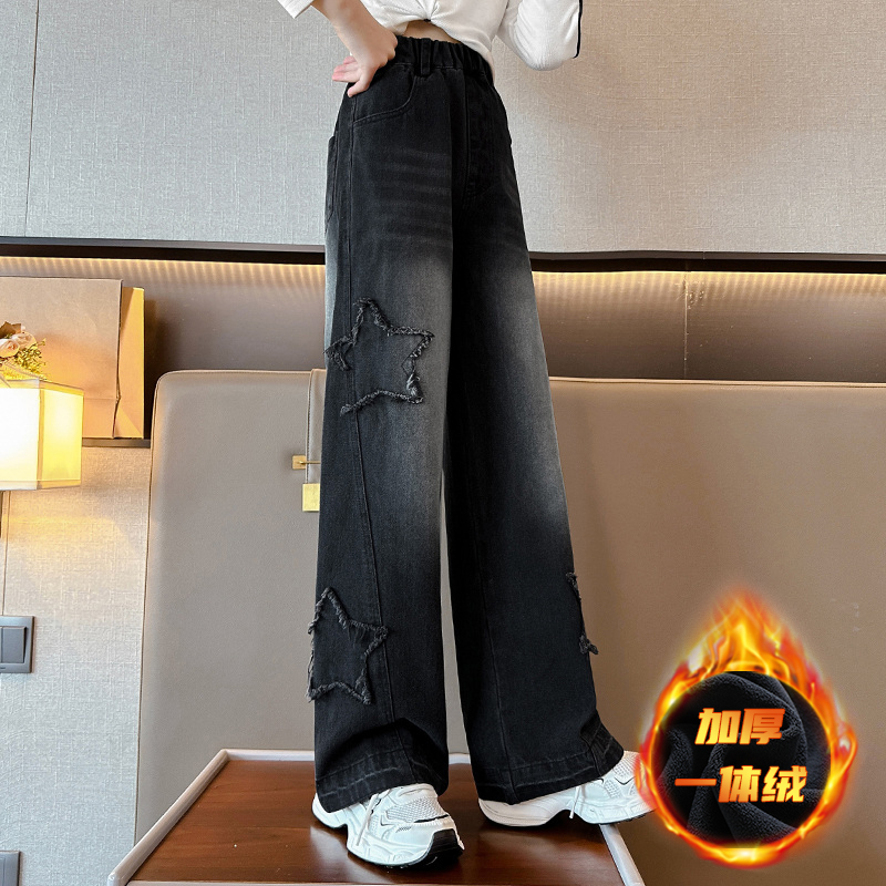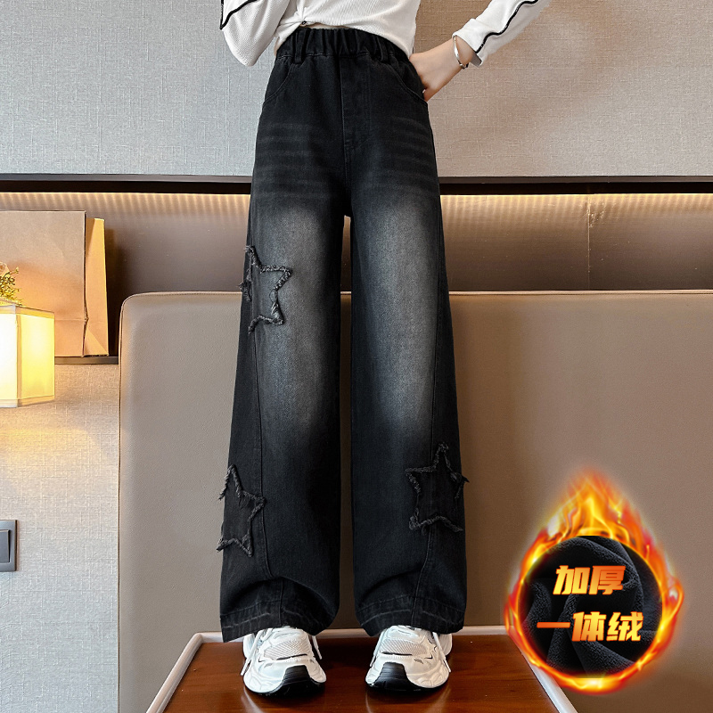 Girls' wide-leg pants for autumn and winter, big children's velvet thickened loose straight jeans, winter style black winter children's pants