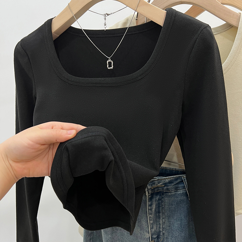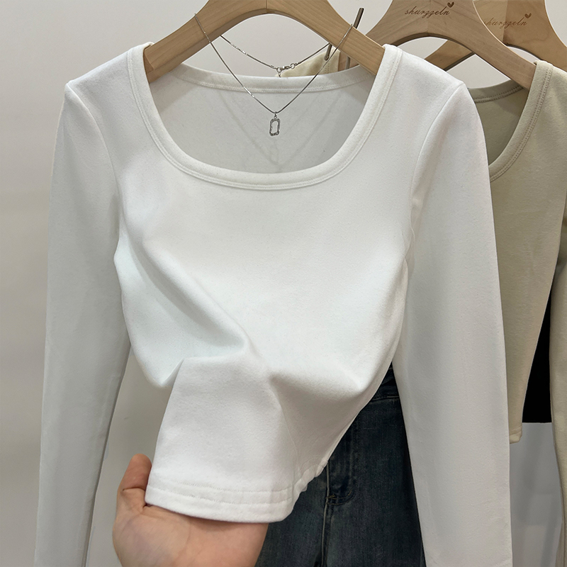 Fan-style collection of waist and shoulder derveled long sleeve t-shirt female autumn winter inner lap with irregular arched lower swing square collar bottom blouses-Taobao