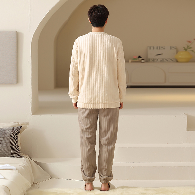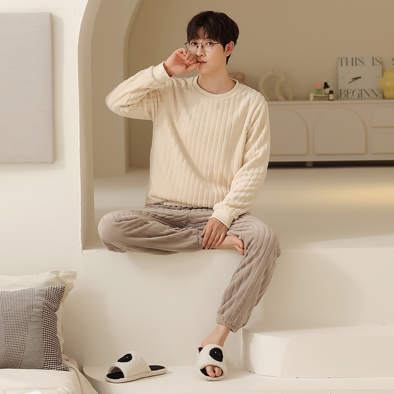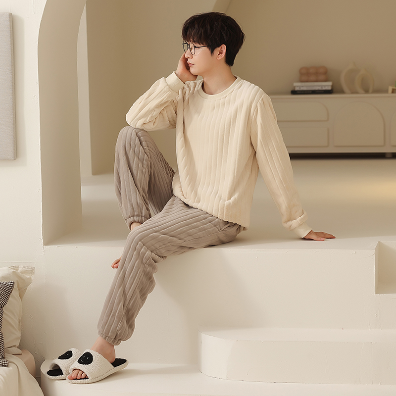 Coral suede pyjamas for men winter thickened with suede warm pure color round collar winter style 2023 new home suits suit-Taobao