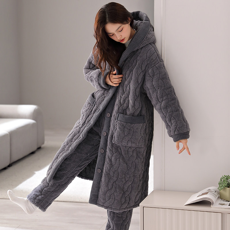Sleeping robe winter style female plus suede thickened three-ply clip cotton long section Two suit Lions Coral Suede Pajamas Winter New-Taobao
