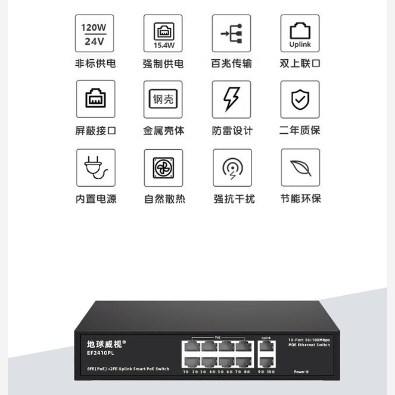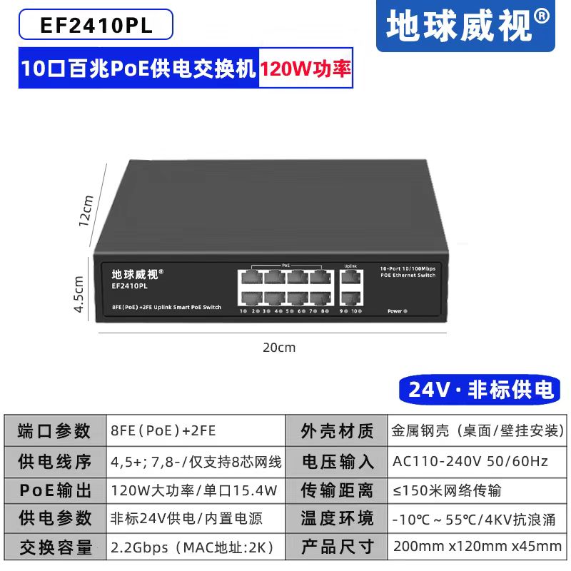 Earth Vision EF2410PL 100-megabit 10-port non-standard POE switch 24v strong power supply 120W high power lightning protection