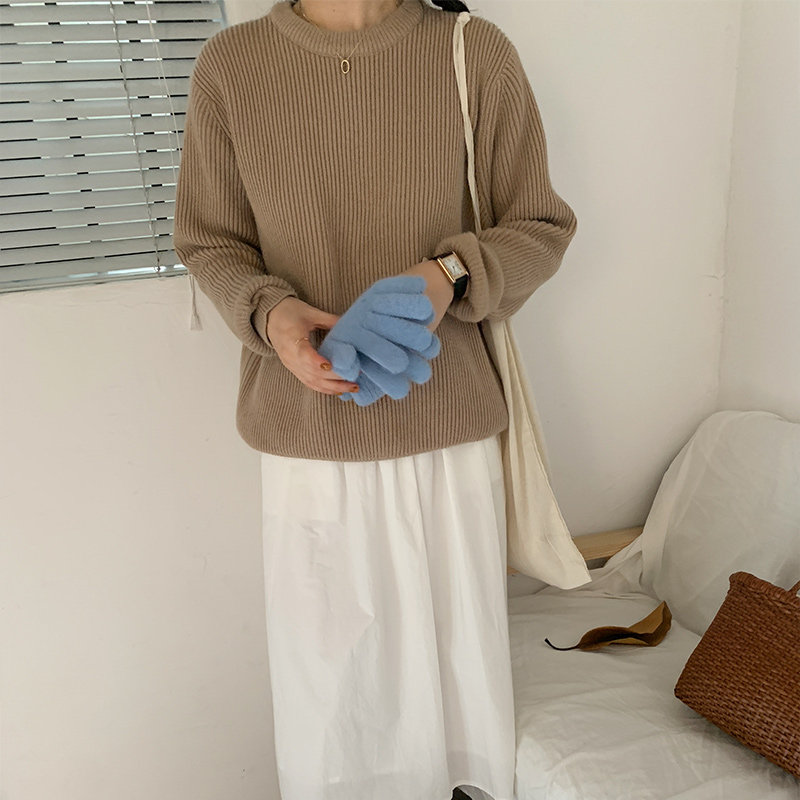 Homemade autumn-winter Dingdye brown curry pure colour sleeve head sweater Female loose Lazy Wind Round Collar Thickened outside wearing Merard-Taobao