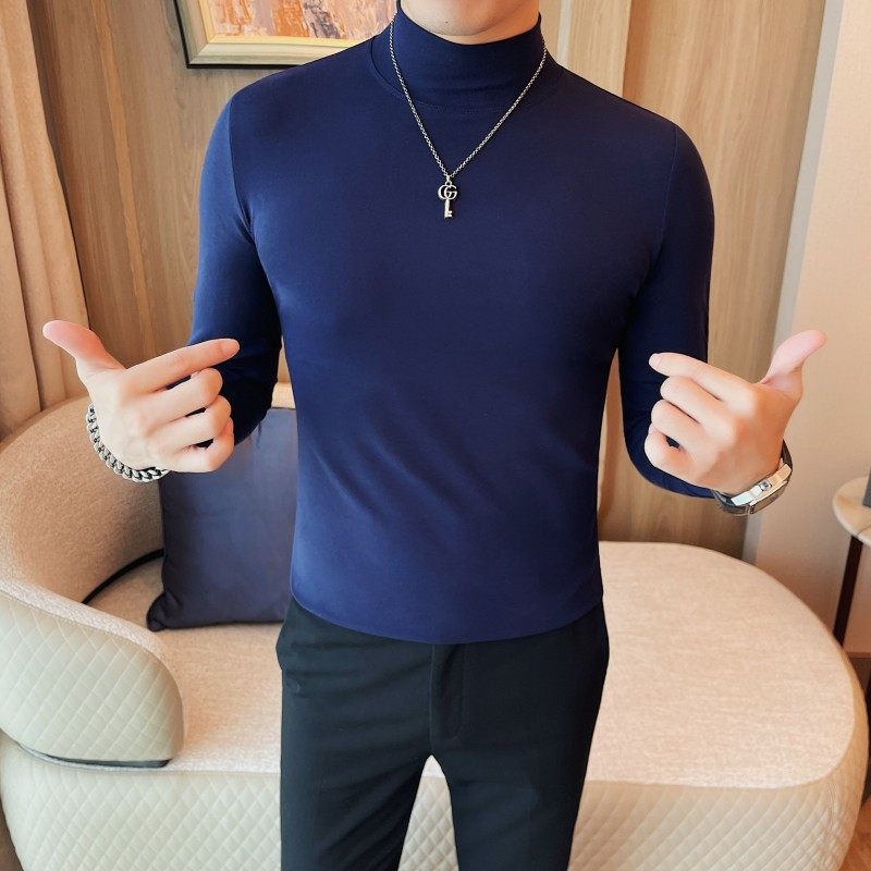 Men's middle collar long sleeve elastic beating undershirt Korean version with pure color autumn and winter 100 lap and half height T-shirt trend-Taobao