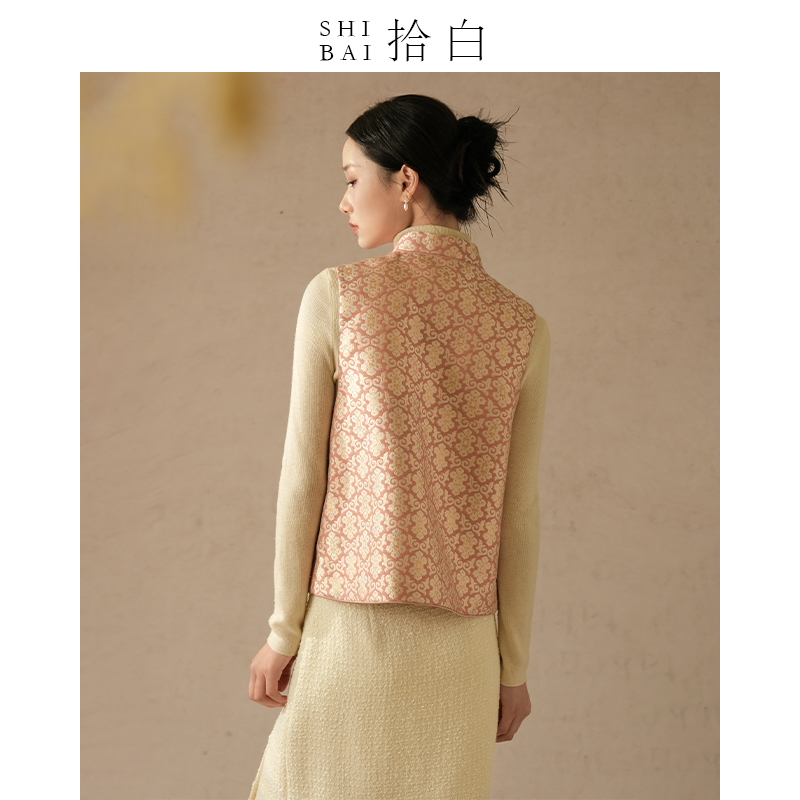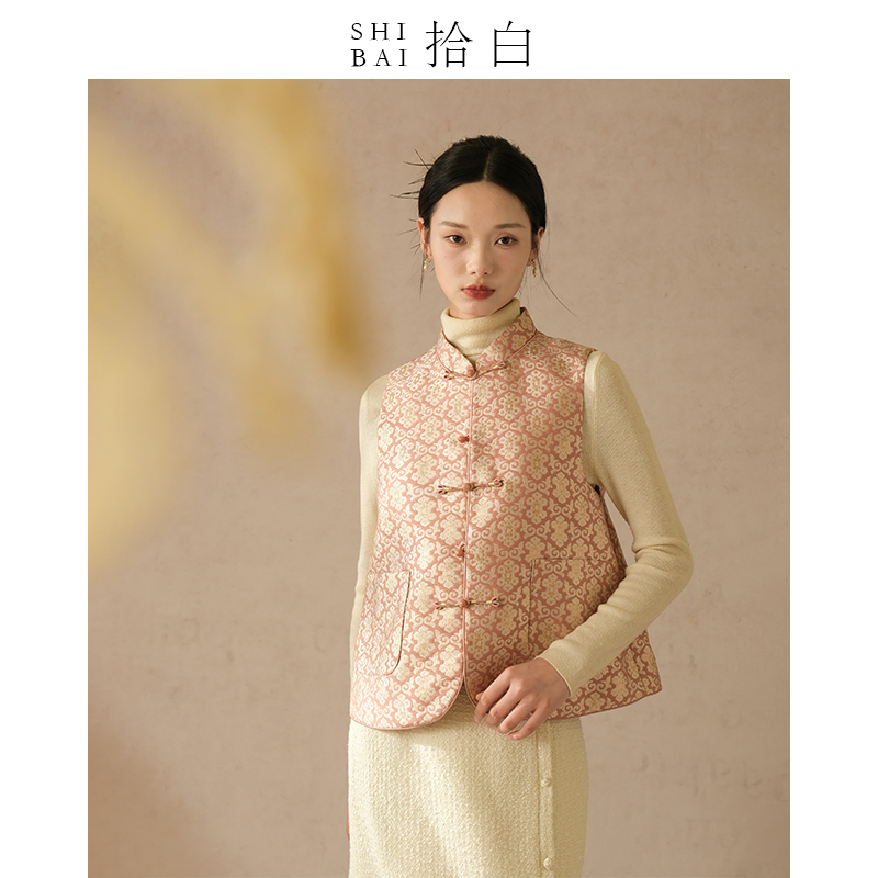 SHIBAI ten White New Chinese Machia Autumn Winter Improvement Tang Dress Country Wind Women's Clothing Pink Disc Buckle Textured Gold Jacquard Blouse-Taobao