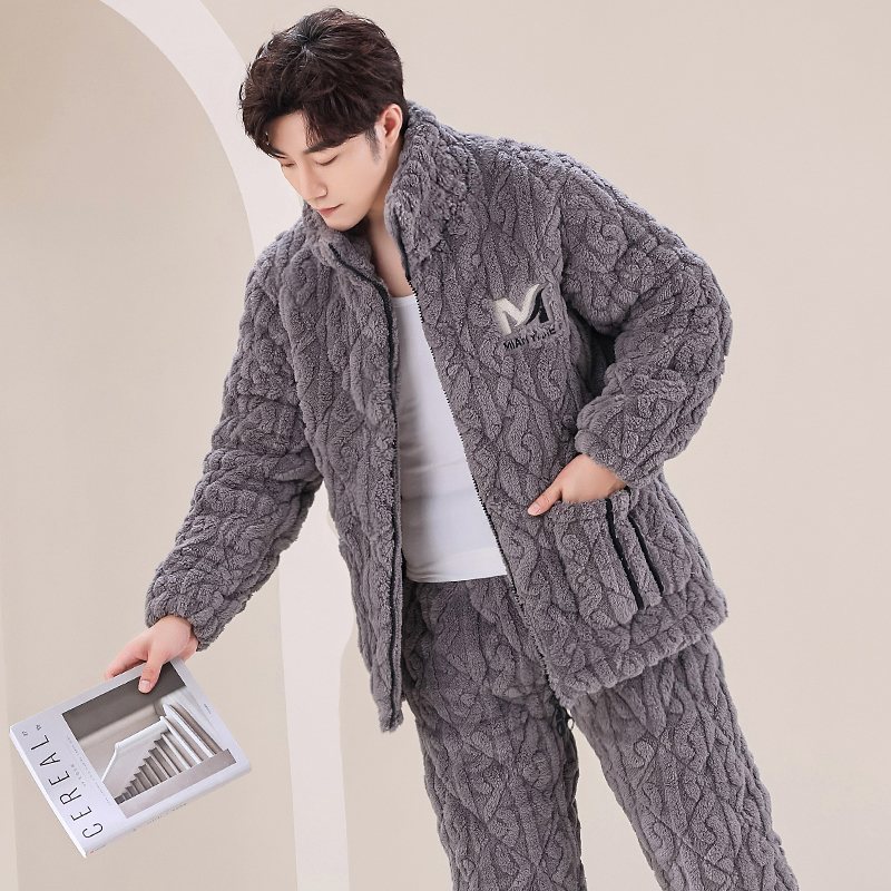 New men's autumn winter three layers clip cotton pyjamas coral suede with velvet thickened flannel home for winter suits-Taobao