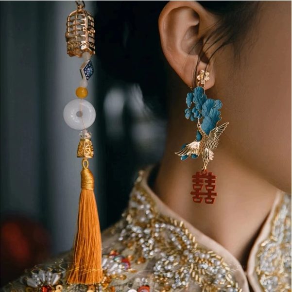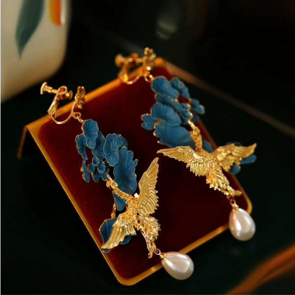 A529 flying crane pearl ear clip (no earhole) A527 flying crane character earrings (with earholes)