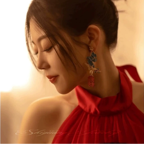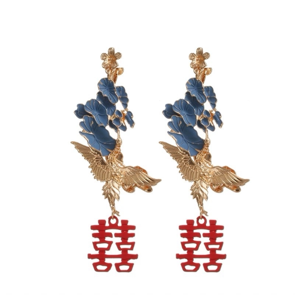 Chinese Earrings Jingtai Blue Ear Clip without earbuds Earrings Flowers Micro Inlaid Double Delight Earrings Palace Temperament Qipao Accessories-Taobao
