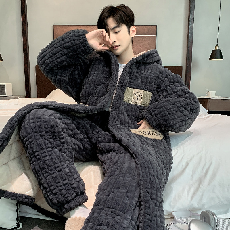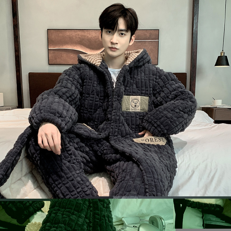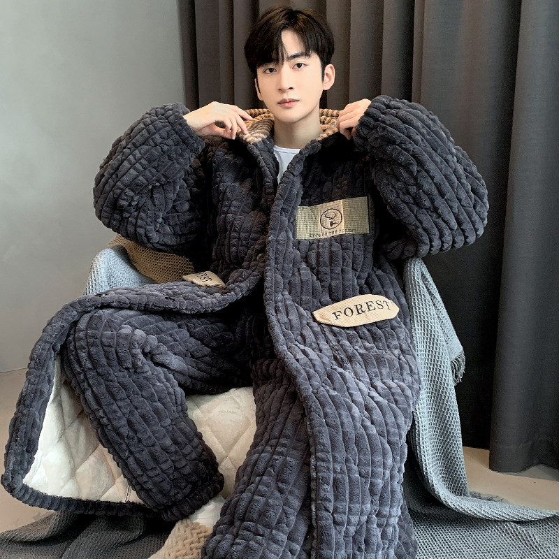 Men's Sleeping Clothes Autumn Winter Coral Suede Thickened 3-layer clip cotton Winter Even hat sleeping robe can be worn outside the home clothes-Taobao