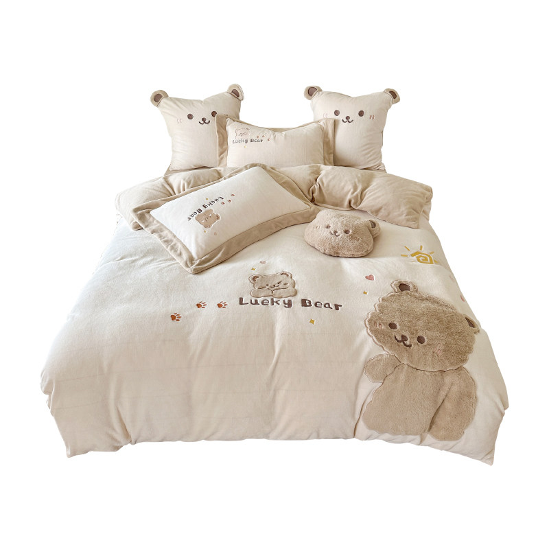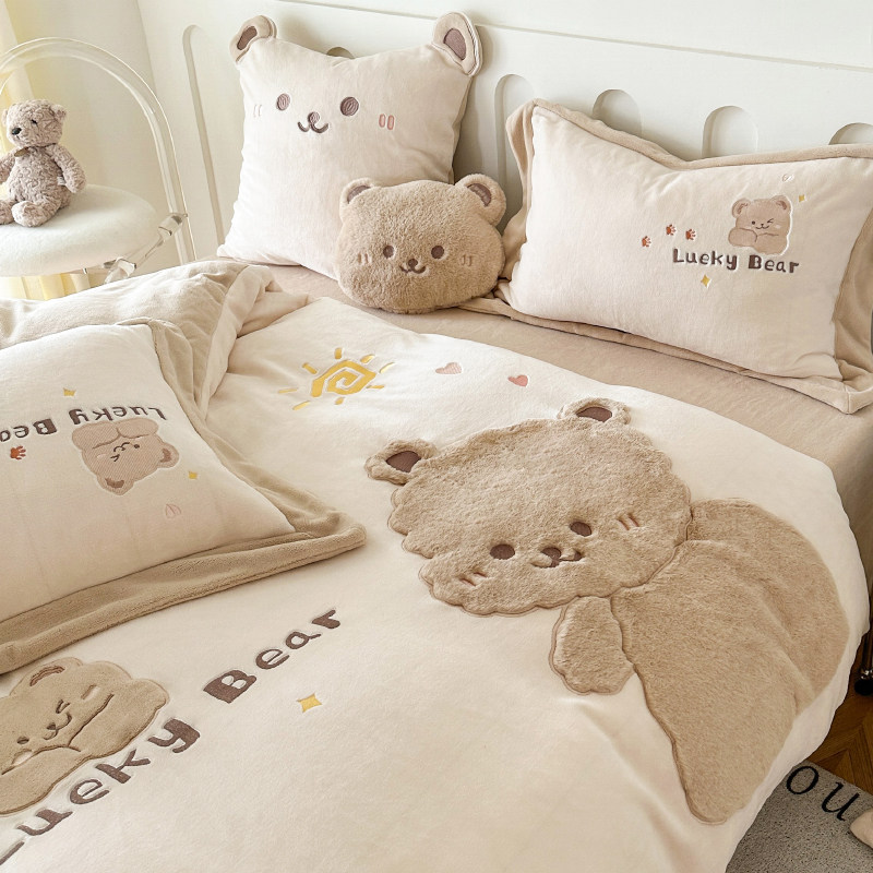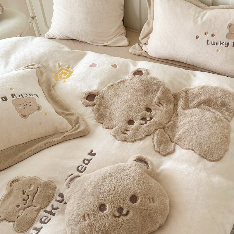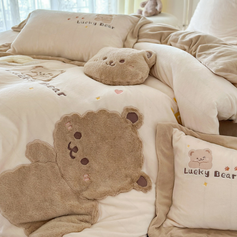 Autumn winter card ventilated and warm thickened double-sided milk suede four-piece set of cute little bear rabbit fur quilt cover bedding-Taobao