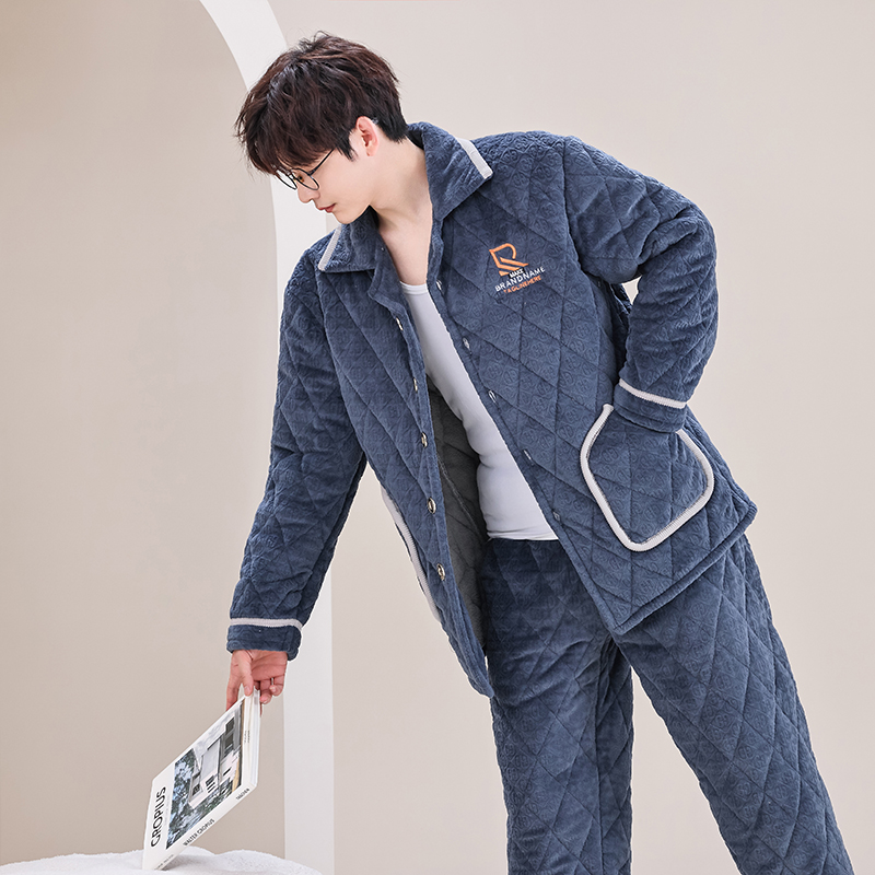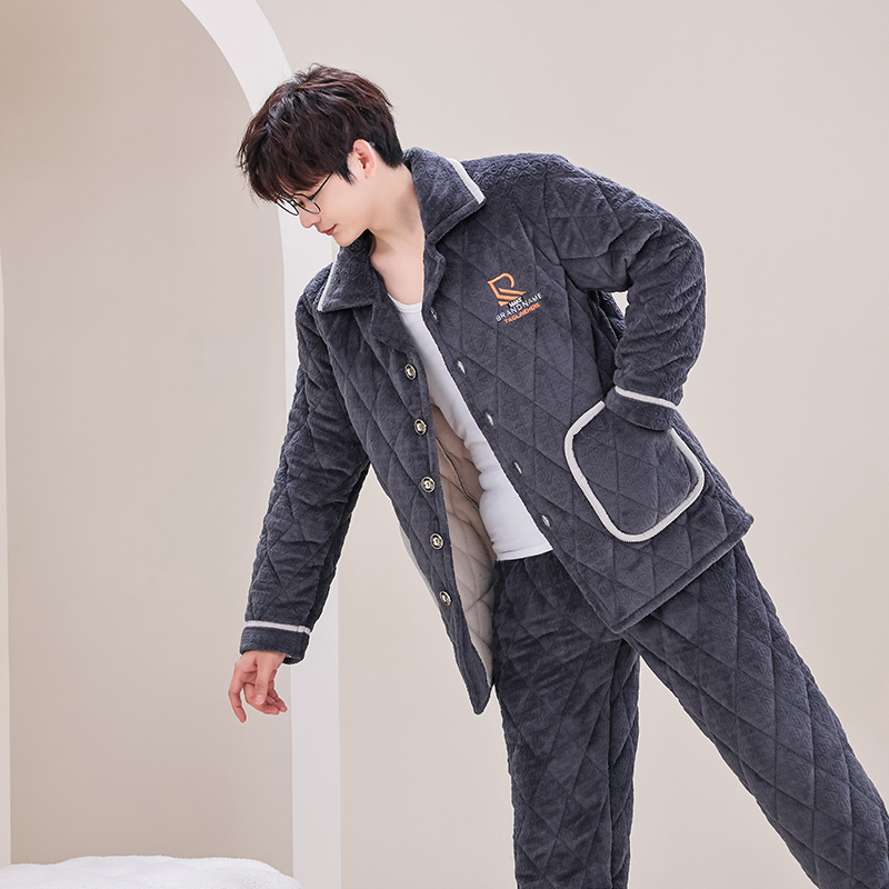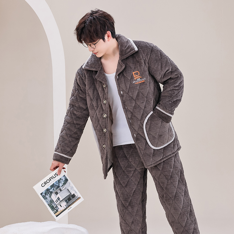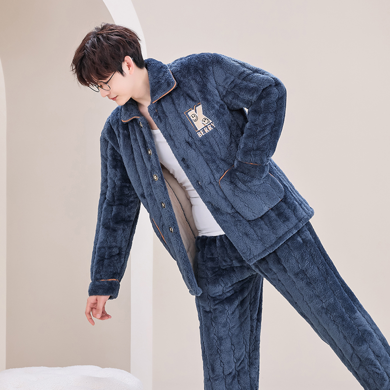 Autumn Winter Coral Suede Thicken Plus Suede Three Layers Clip Cotton Padded Jacket Men's Pyjamas Warm Home Suits Suit External Wear-Taobao