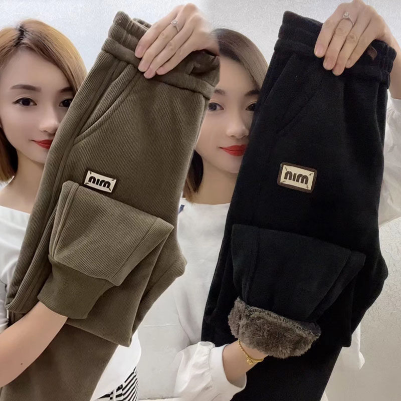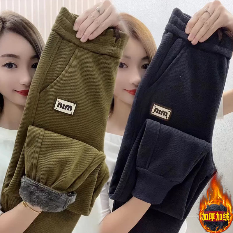 Autumn Winter New Lamb Suede Casual Pants Woman Plus Suede Thickening Chenille Strips Suede Pants High Waist Bunches Kharen Pants-Taobao