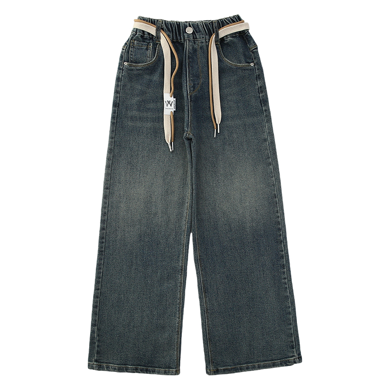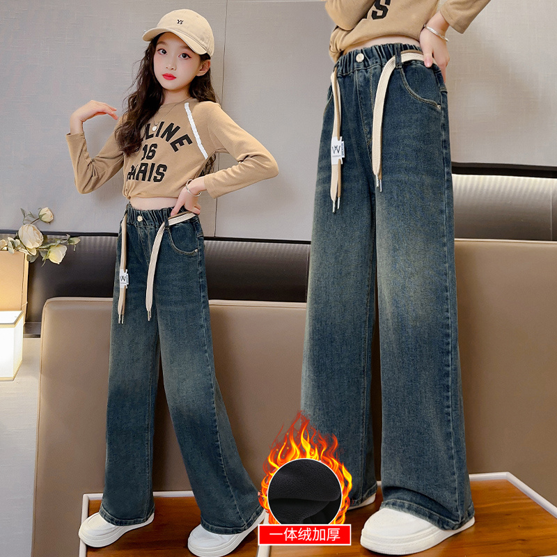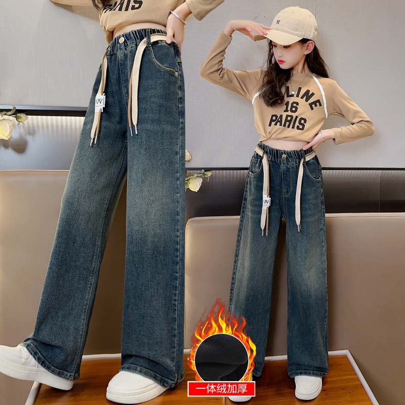 Girls' pants for autumn and winter outer wear plus velvet and thickened one-piece velvet jeans for winter for older girls and children's wide-leg pants