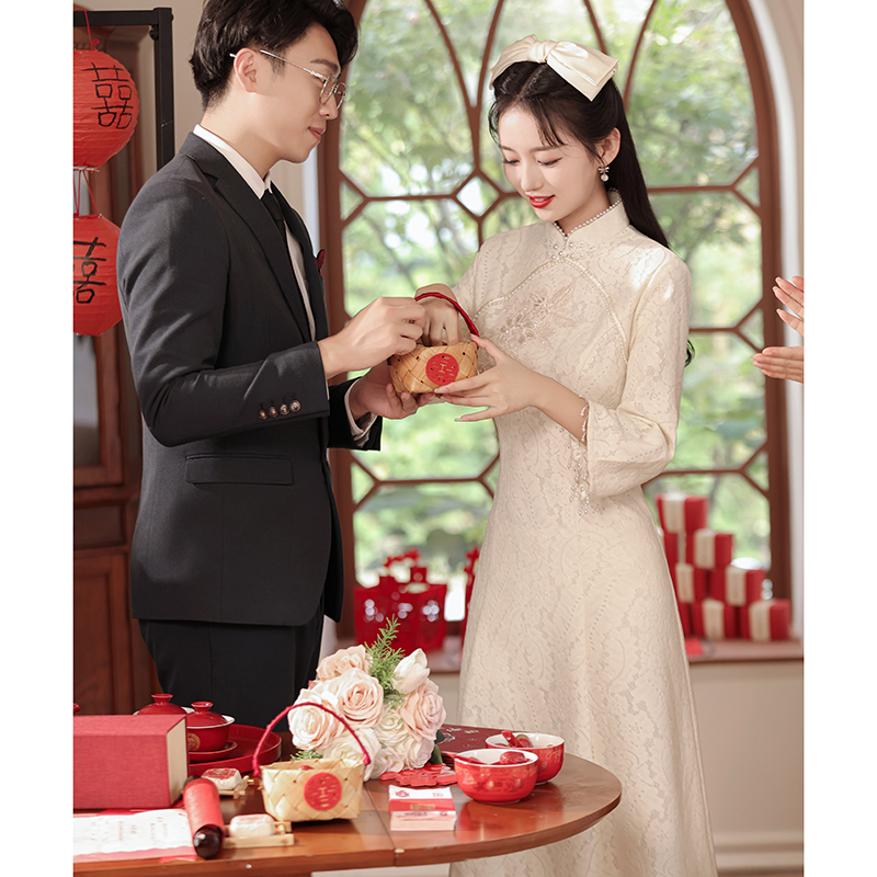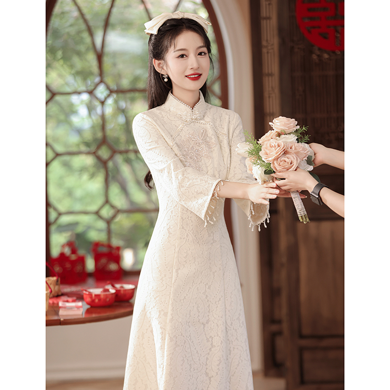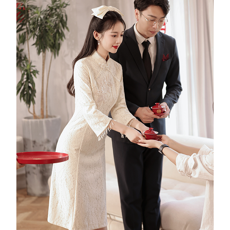 White long sleeve qipao New Chinese-style engagement gown dress normally able to wear 2023 new small sub-collar certificate Autumn Winter-Taobao