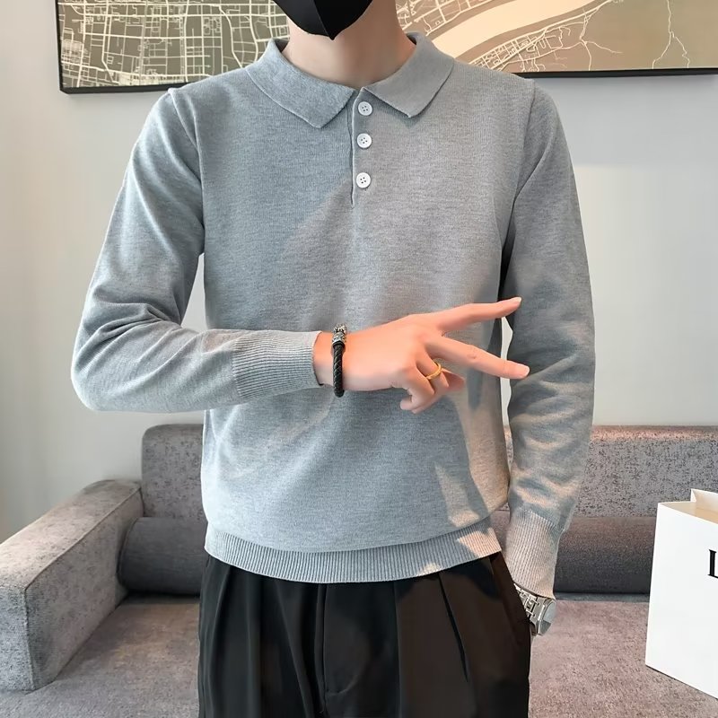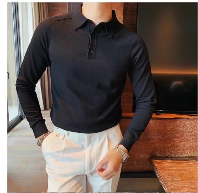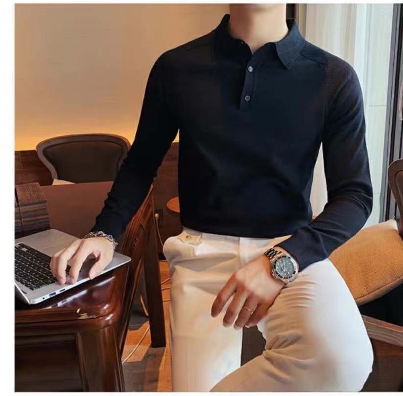Spring Autumn New American Casual Polo Shirts Men's Pure Color Business Knit Thin style Loose Flap Long Sleeve T-shirt Tide-Taobao