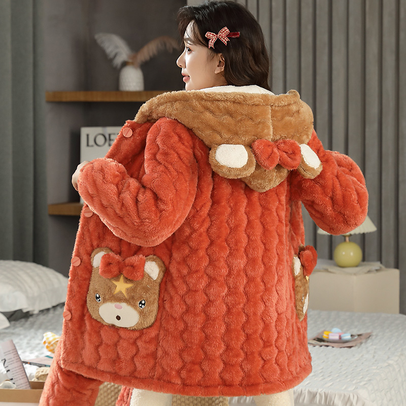 Autumn Winter New Sleepwear Woman Coral Suede Triple Clip Cotton Cute Lian Hat Red Thickening Plus Suede Home Suit-Taobao
