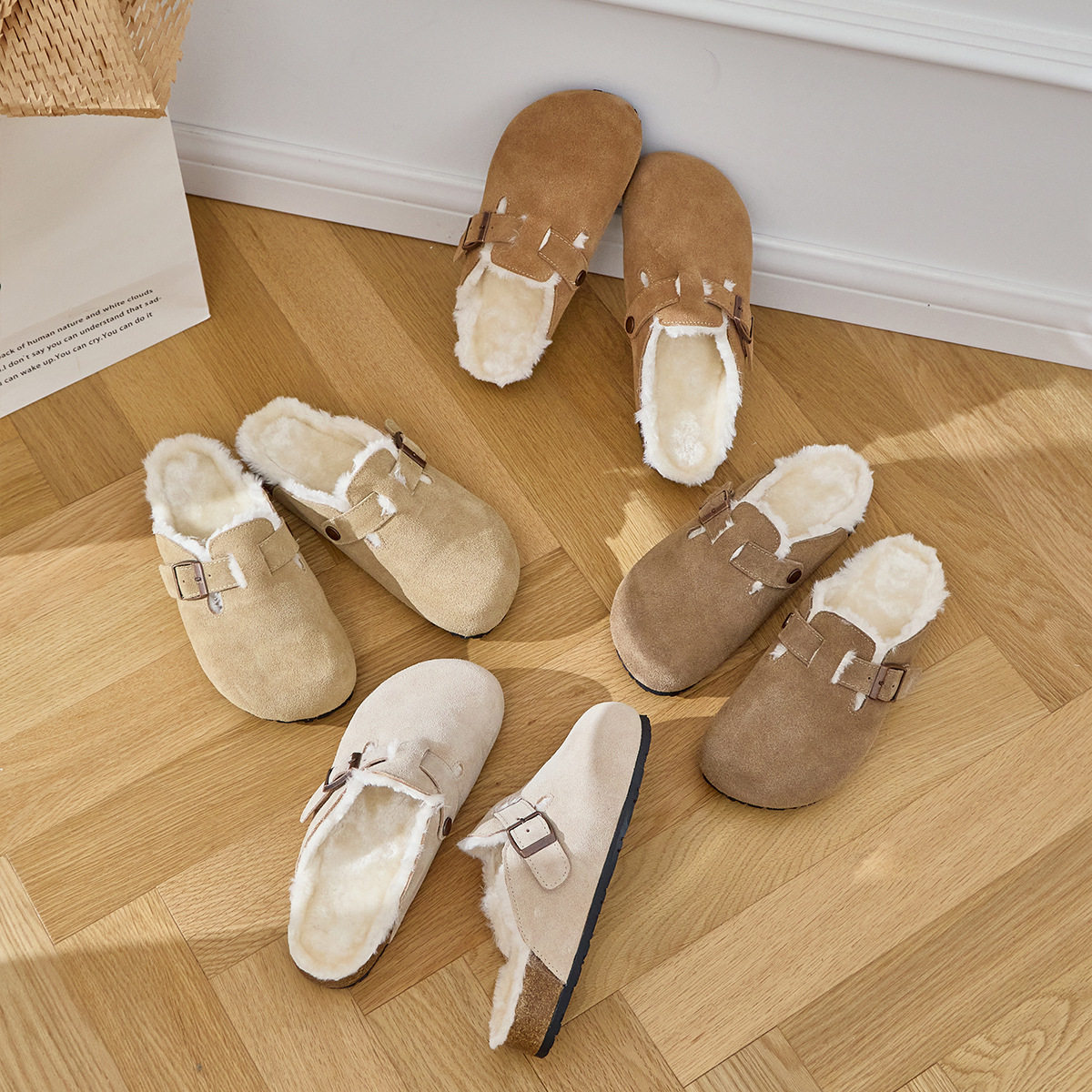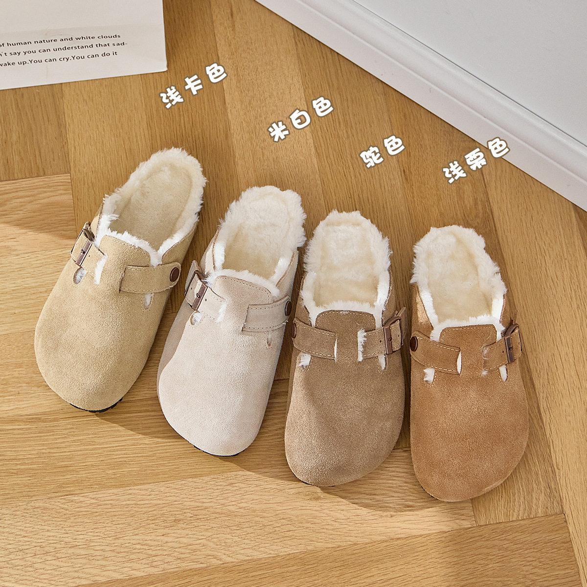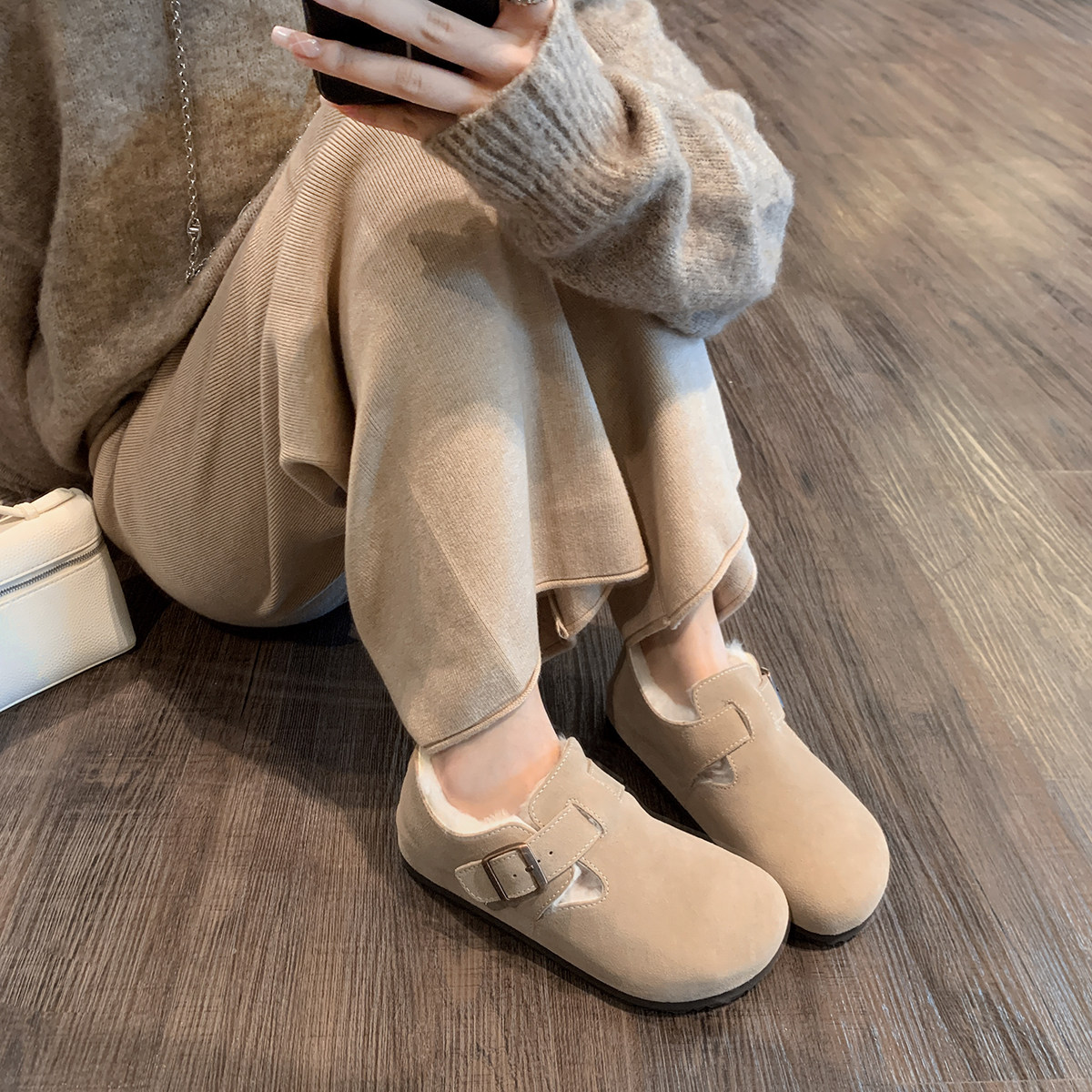 Three-happy-style autumn and winter thick bottom heightening of the burken shoes women full pack semi-tugging wool plus suede warm hair shoes soft-bottom-Taobao