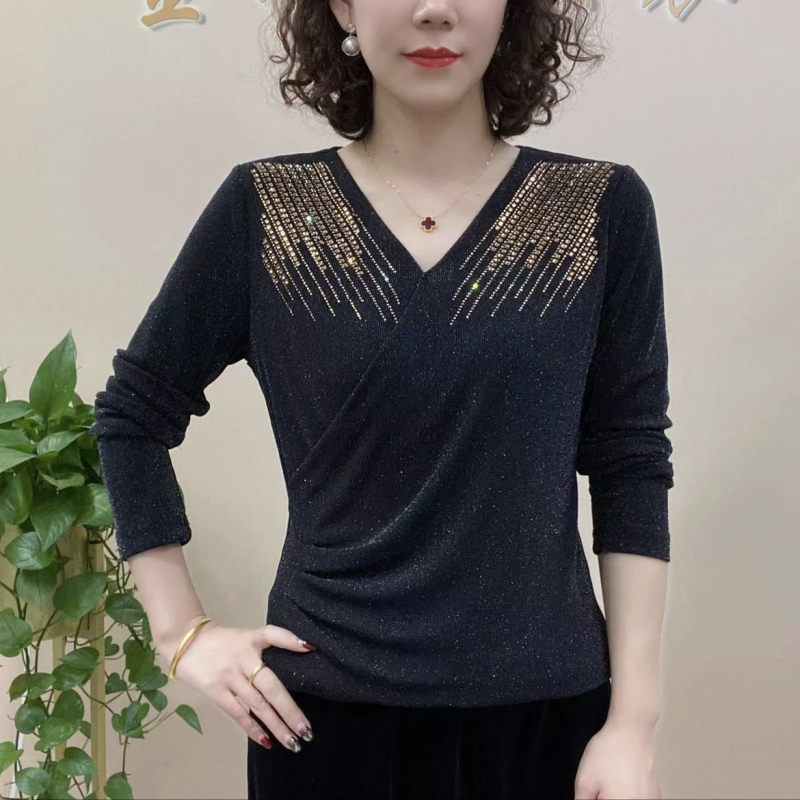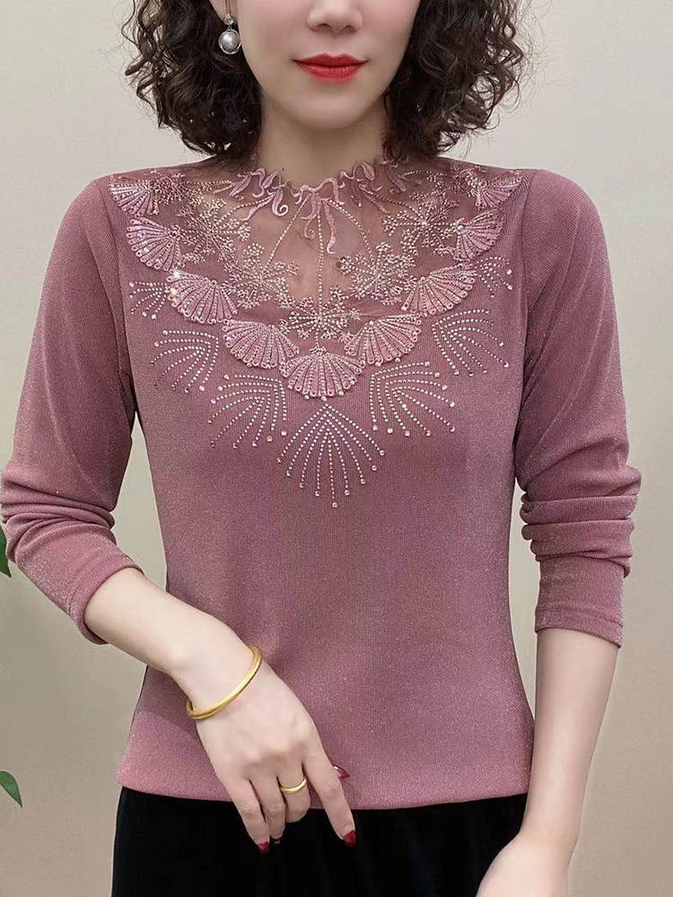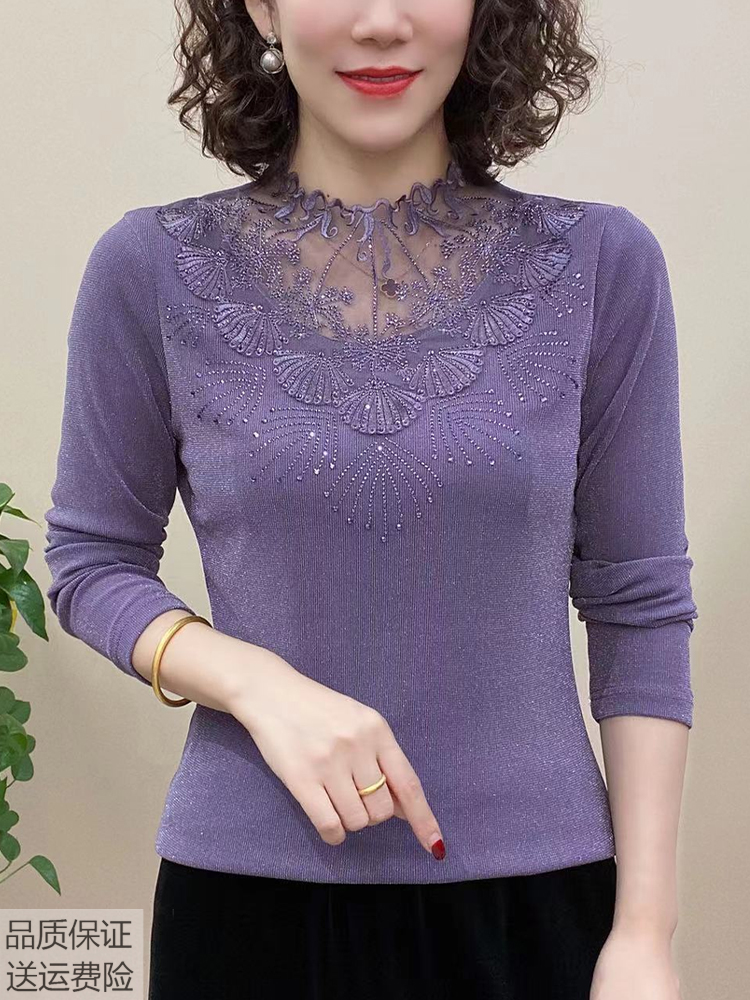 New mom dress V collar long sleeve pure color mesh yarn plus suede undershirt fashion middle age women's temperament elastic blouses-Taobao