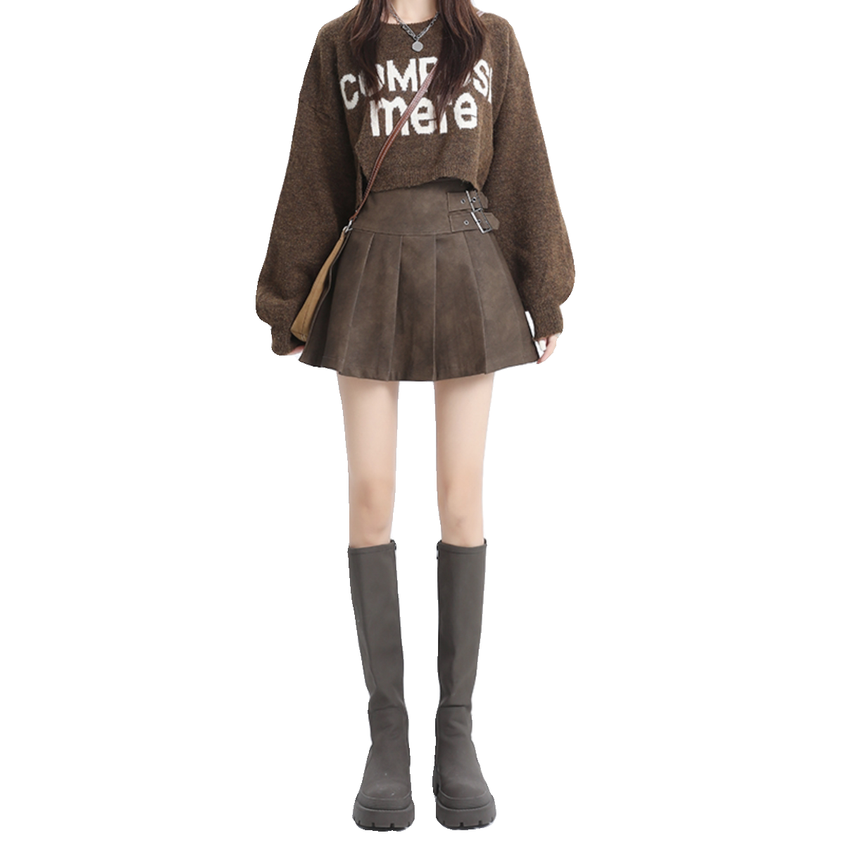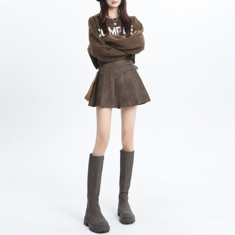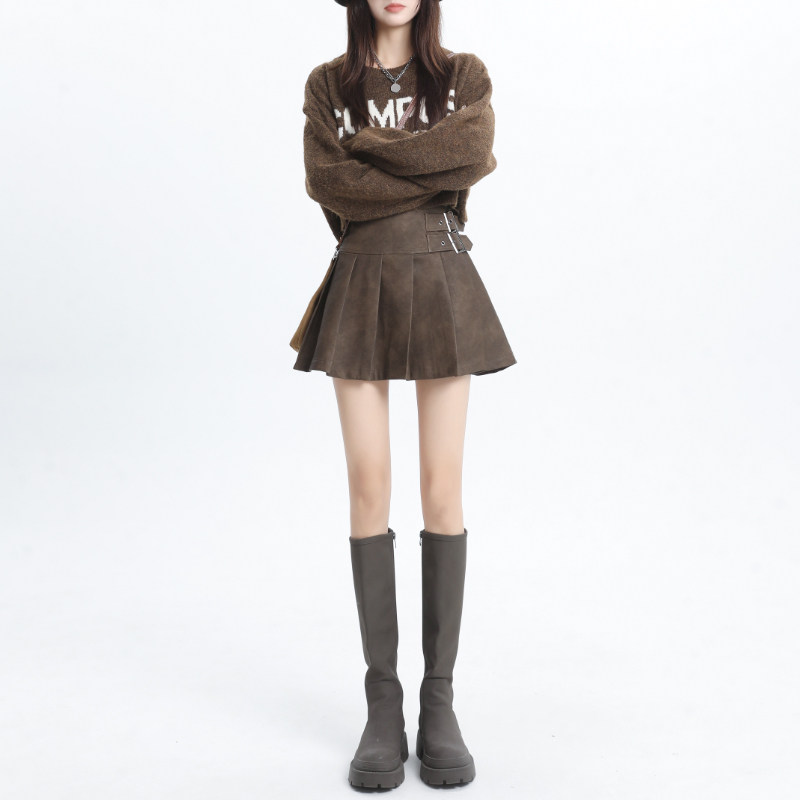 Curly leather skirt half body dress lady autumn winter 2023 new brown high waist display slim pu leather a word bag glutes 100 pleats short skirt-Taobao