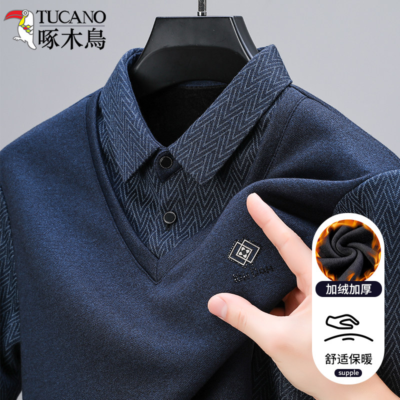 Woodpecker Daddy Autumn Winter Style Long Sleeve T-Shirt Middle-aged Blouse Fake Two Men Plus Suede Thickening Autumn Jersey-Taobao