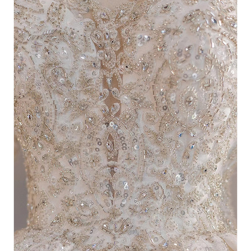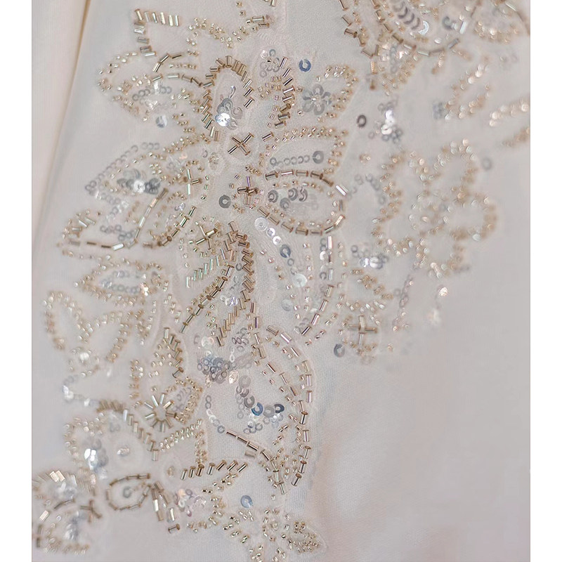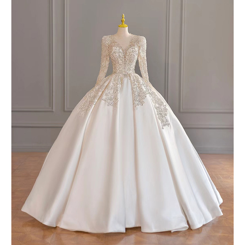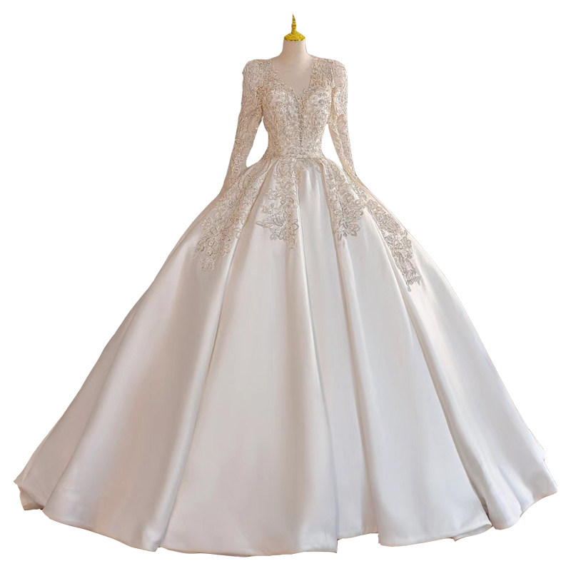 Long sleeves satin main wedding dress Bride 2023 new French style Heavy work V collar Great Pregnant Woman Advanced Texture trailing Winter-Taobao
