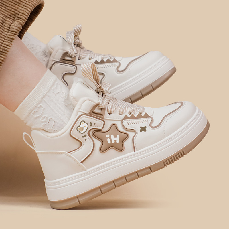 Amy and wheat wheat high help plus suede casual board shoes women Winter cute students warm 2nd cotton shoes star-shaped small white shoes-Taobao