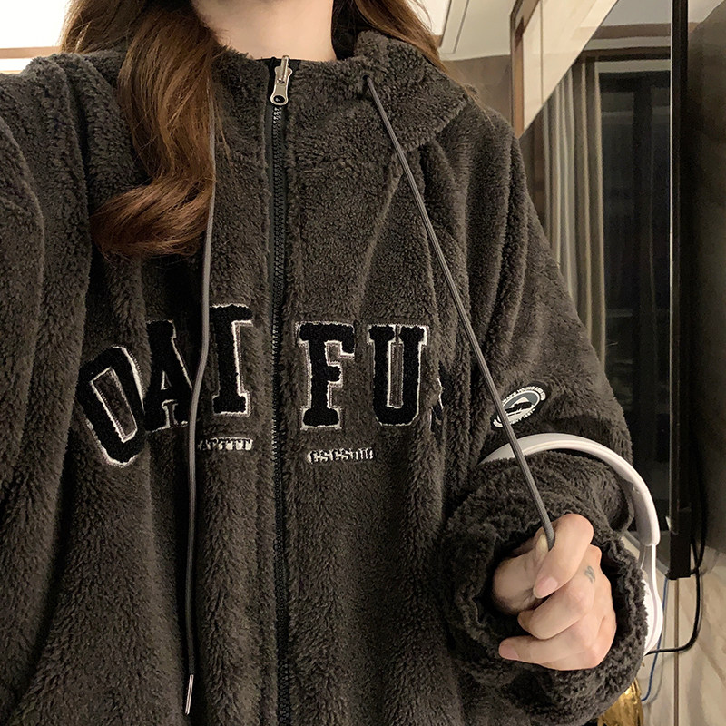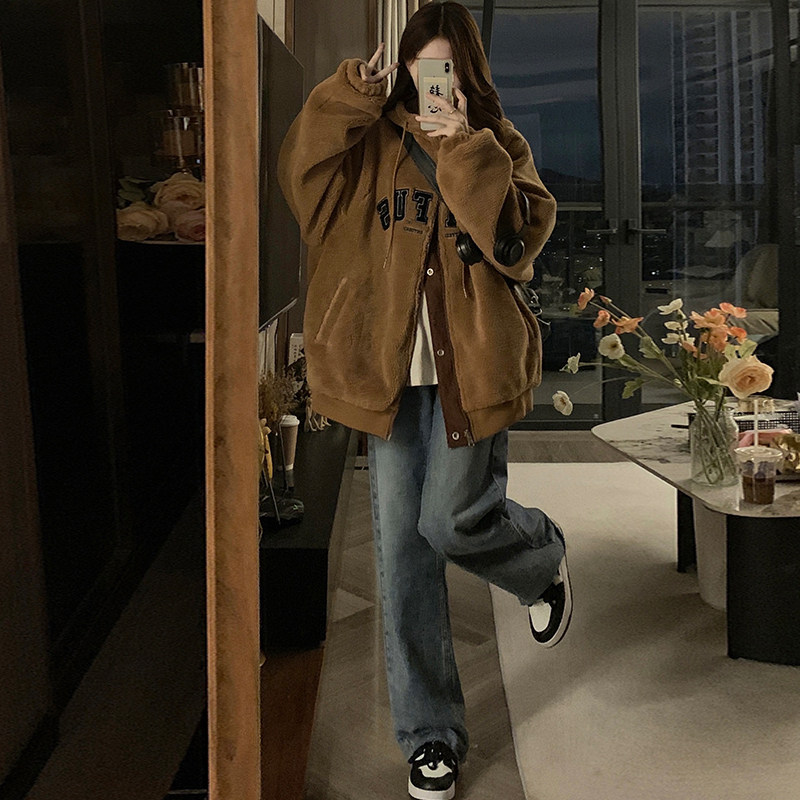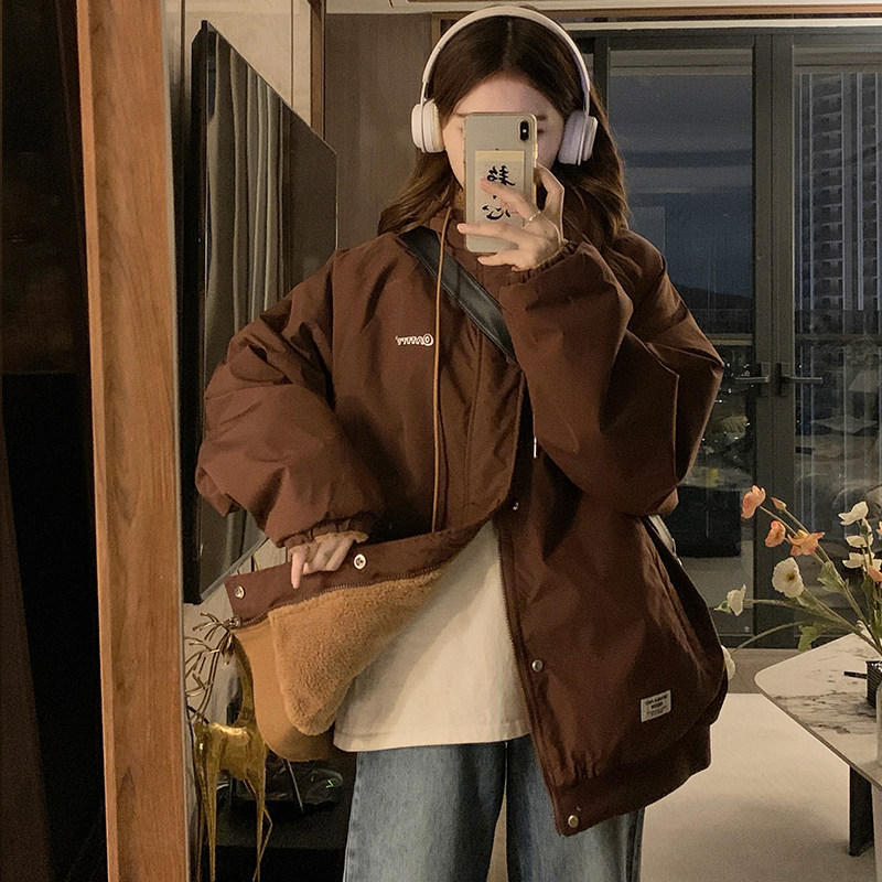 Double sided wearing baseball clothes lamb wool jacket woman 2023 Winter new thickened Cavet American retro cotton padded jacket-Taobao