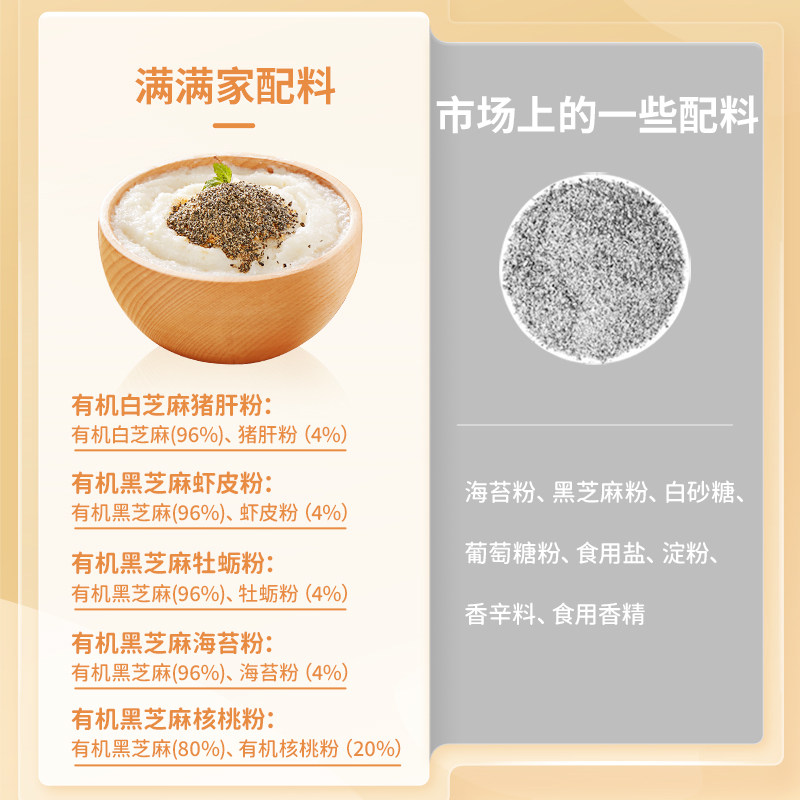 (DHA) Organic Black Sesame Walnut Powder (Iron) Organic White Sesame Pig Liver Powder (Zinc) Organic Black Sesame Oyster Powder (Calcium) Organic Black Sesame Sea Tunic Powder (Calcium) Organic Black Sesame Shrimp Peel Powder