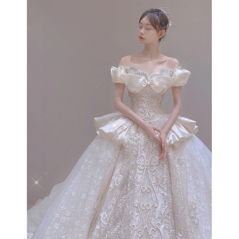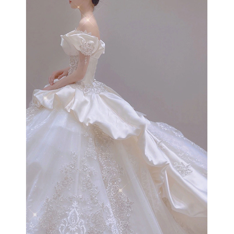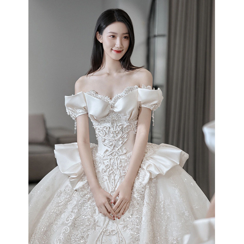 One-shoulder French satin light wedding dress 2024 new bridal high-quality fugitive princess Qi Di Zhu yarn