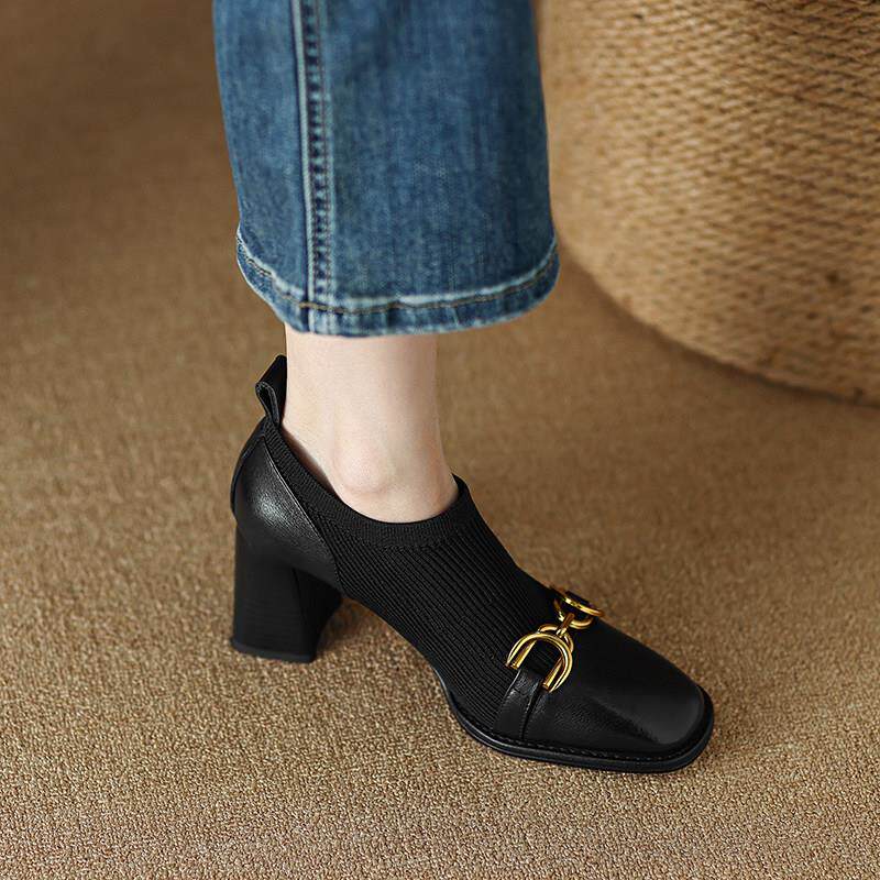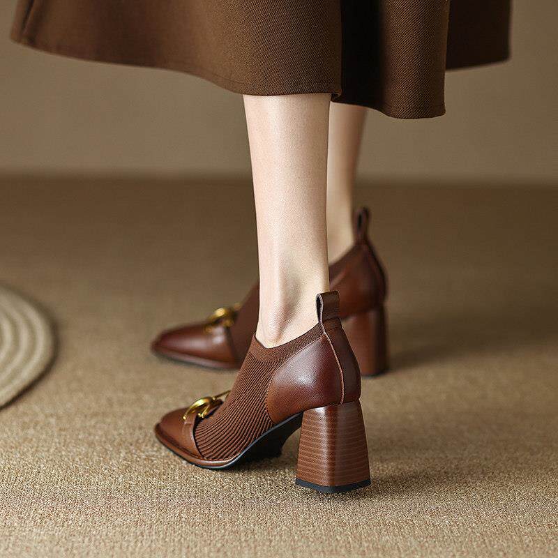 Ocnltiy retro fashion genuine leather high heel single shoe woman 2023 spring autumn new women's shoes square head coarse heels with little leather shoes-Taobao