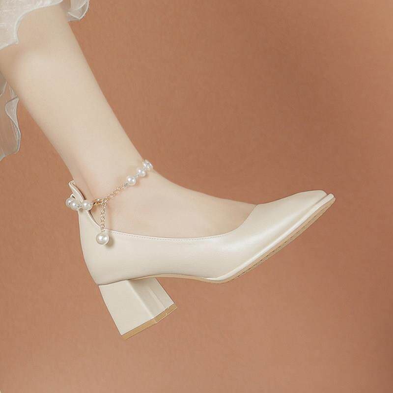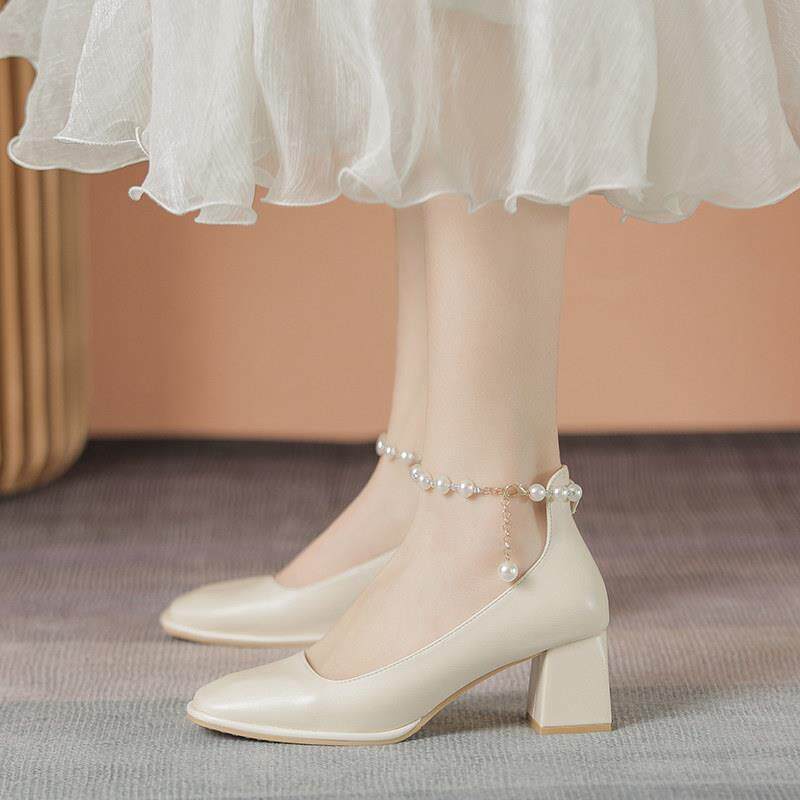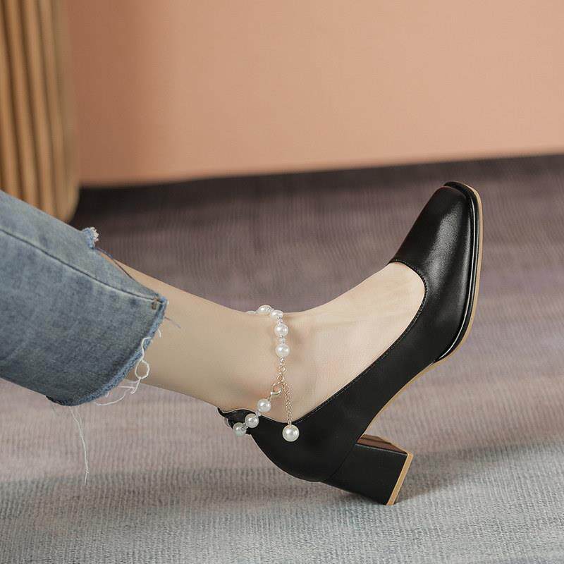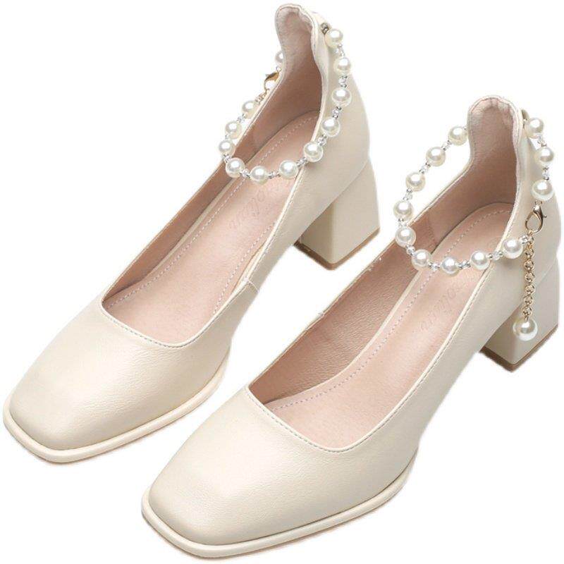 Genuine leather single shoe woman 2023 spring new high heel shoe matching dresses pearl square head coarse heels with fairy wind Marie treasures shoes-Taobao