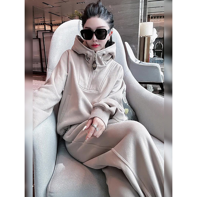 Fashion Superior Sense Casual Sports Suit Women 2023 Autumn Winter Plus Suede hat & clothing Conspicuble Skinny pants Two sets-Taobao