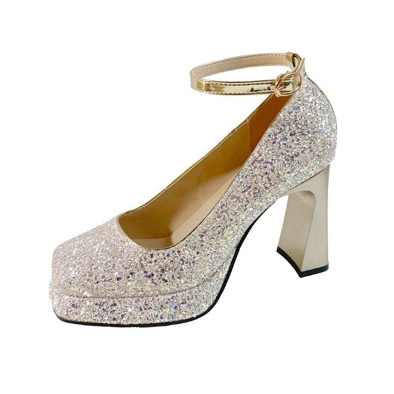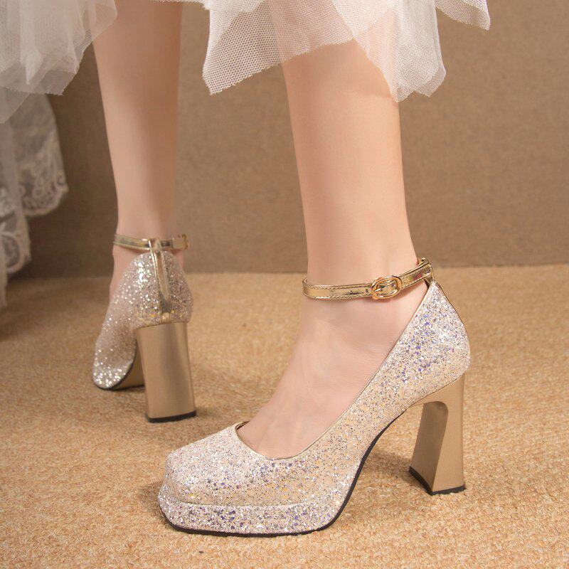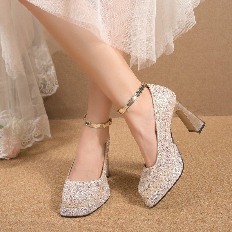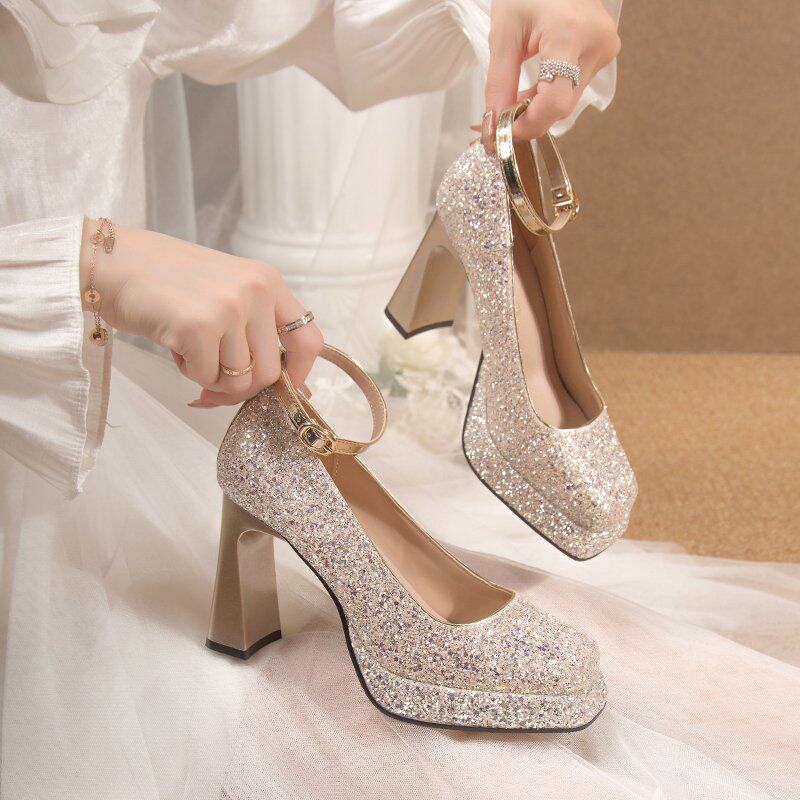 Wedding shoes with high heel shoes 2023 autumn winter new light mouth coarse heel Waterproof Terrace Crystal Wedding Shoes Princess Square Head-Taobao